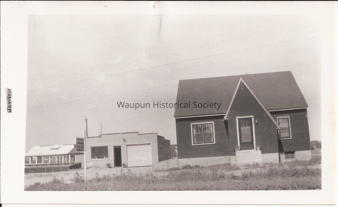 Black and white photo of Weinheimers - Home and Storm Window Greenhouse. Early start of Waupun Florist, as indicated on back of photo. Date of May 1966 is on border of photo. This was included with paperwork compiled of historical info for the Waupun 1976 Bicentennial Celebration.Acquisition