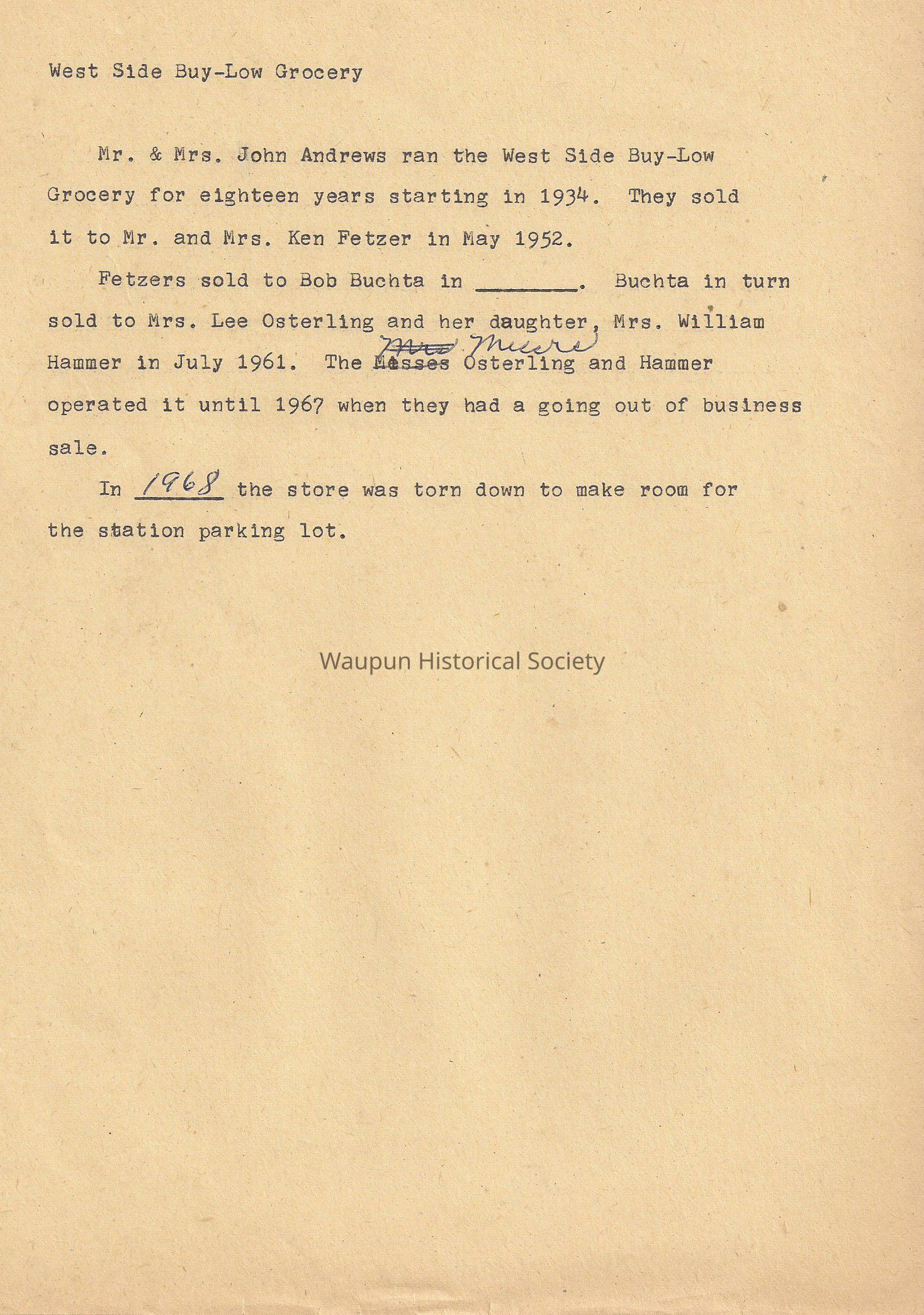 Fetzers sold to Bob Buchta in________. Buchta in turn sold to Mrs. Lee Osterling and her daughter, Mrs. William Hammer in July 1961, The Mrs. Osterling and Hammer operated it until 1967 when they had a going out of business sale.