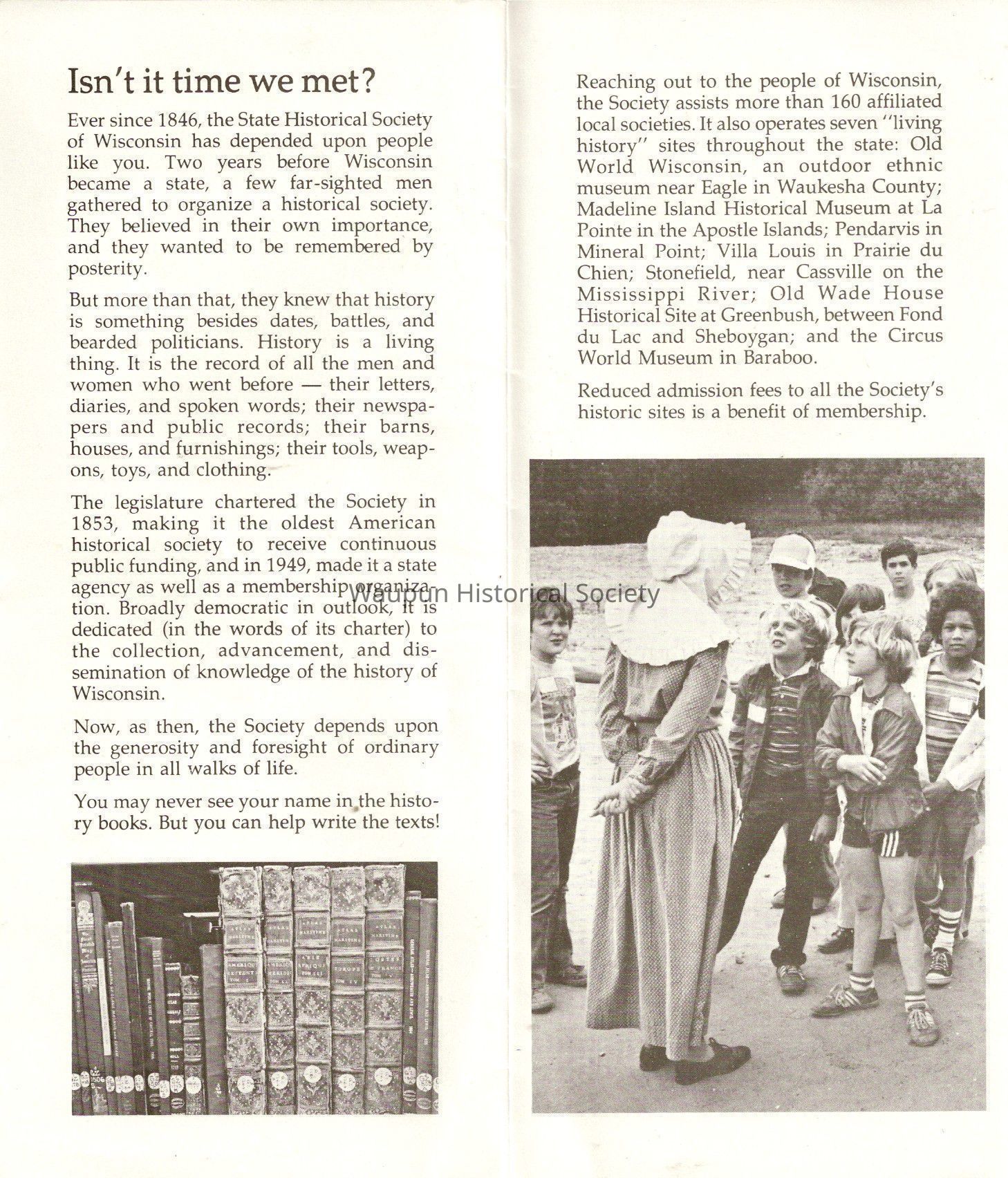 Family members pay half-price admission to the Society's seven historic sites for parents and their minor children; they also receive Badger History, a colorful school-age historical magazine.Acquisition