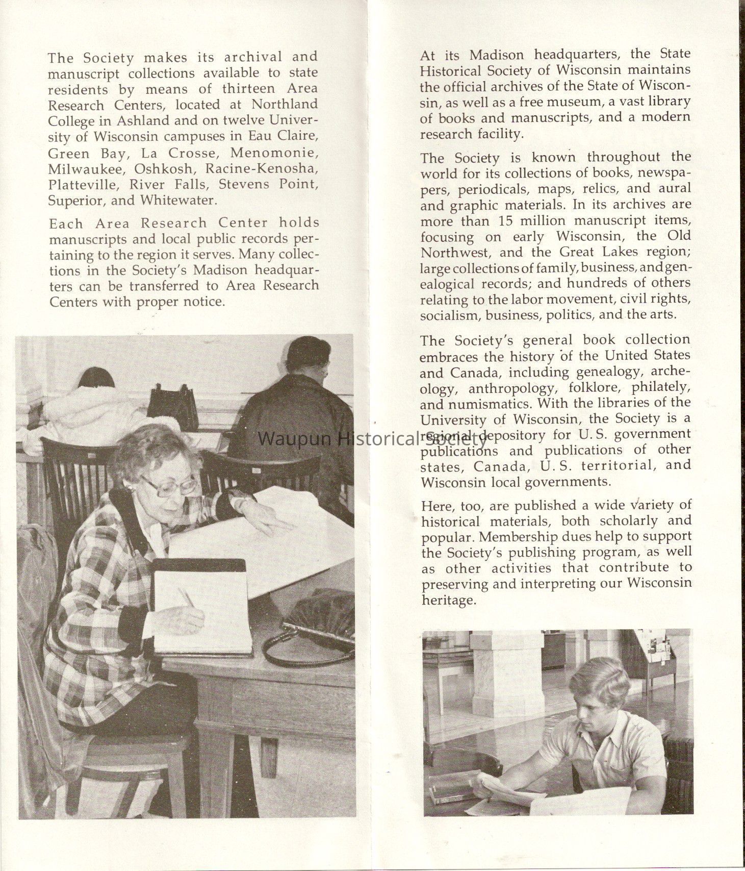 The Society's general book collection embraces the history of the United States and Canada, including genealogy, archeology, anthropology, folklore, philately, and numismatics. With the libraries of the University of Wisconsin, the Society is a regional depository for U. S. government publications and publications of other states, Canada, U. S. territorial, and Wisconsin local governments.