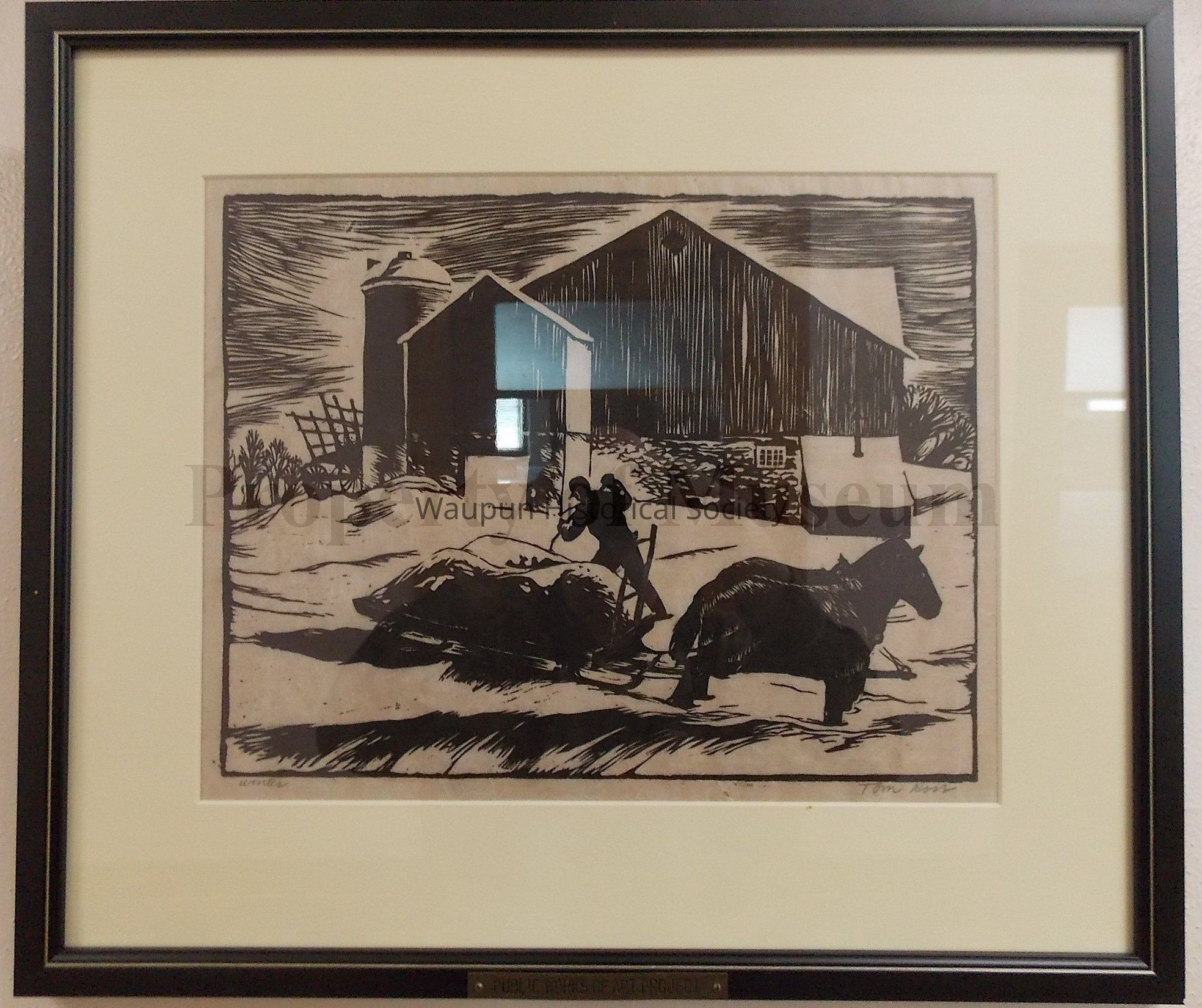 Wood block print, black on tan background, black frame, under glass of a man loading a wagon in the snow. By Tom Lee Rost