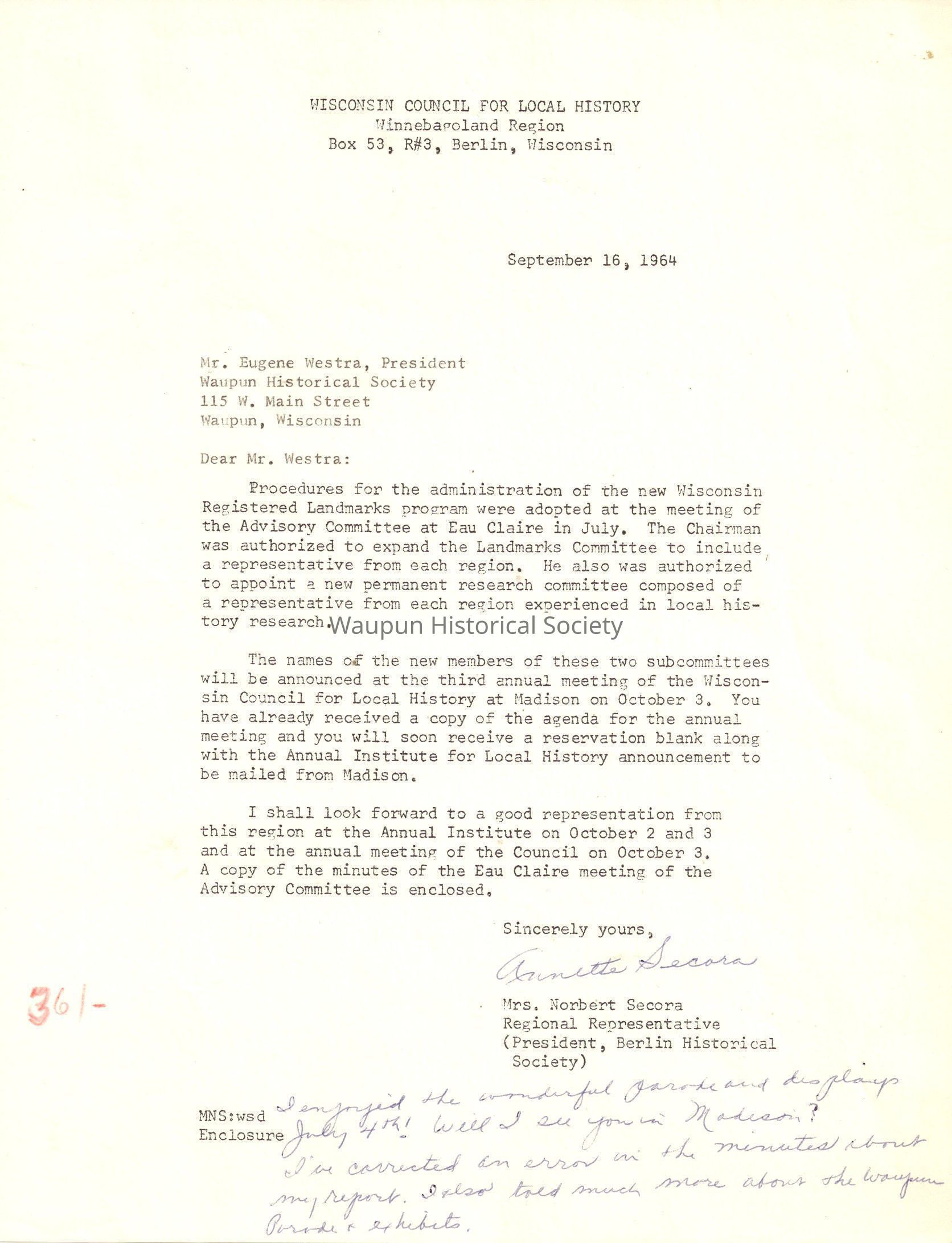 Waupun Historical Society, Wisconsin Council For Local History, 1964Entry/Object ID
