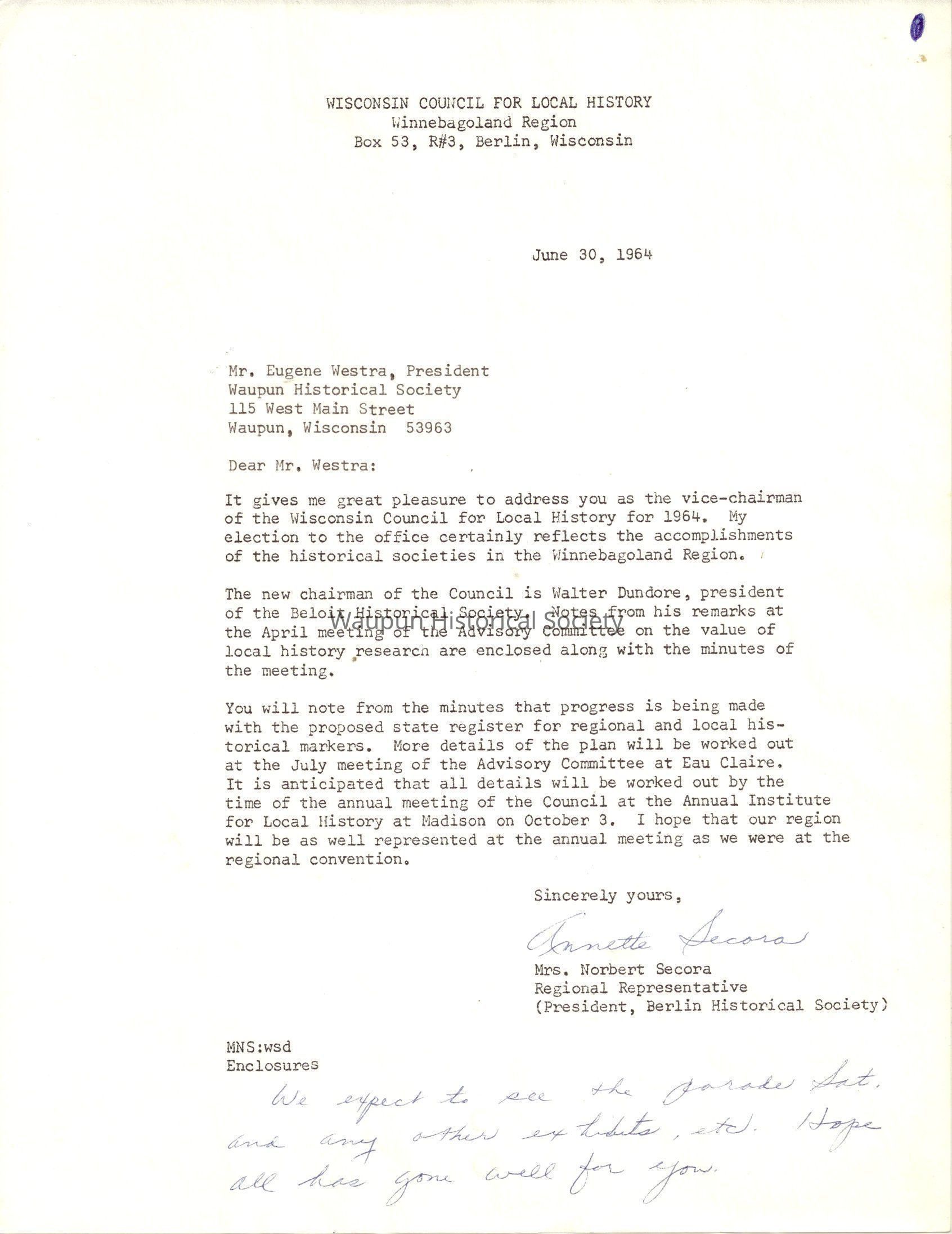 Waupun Historical Society, Wisconsin Council For Local History, 1964Entry/Object ID