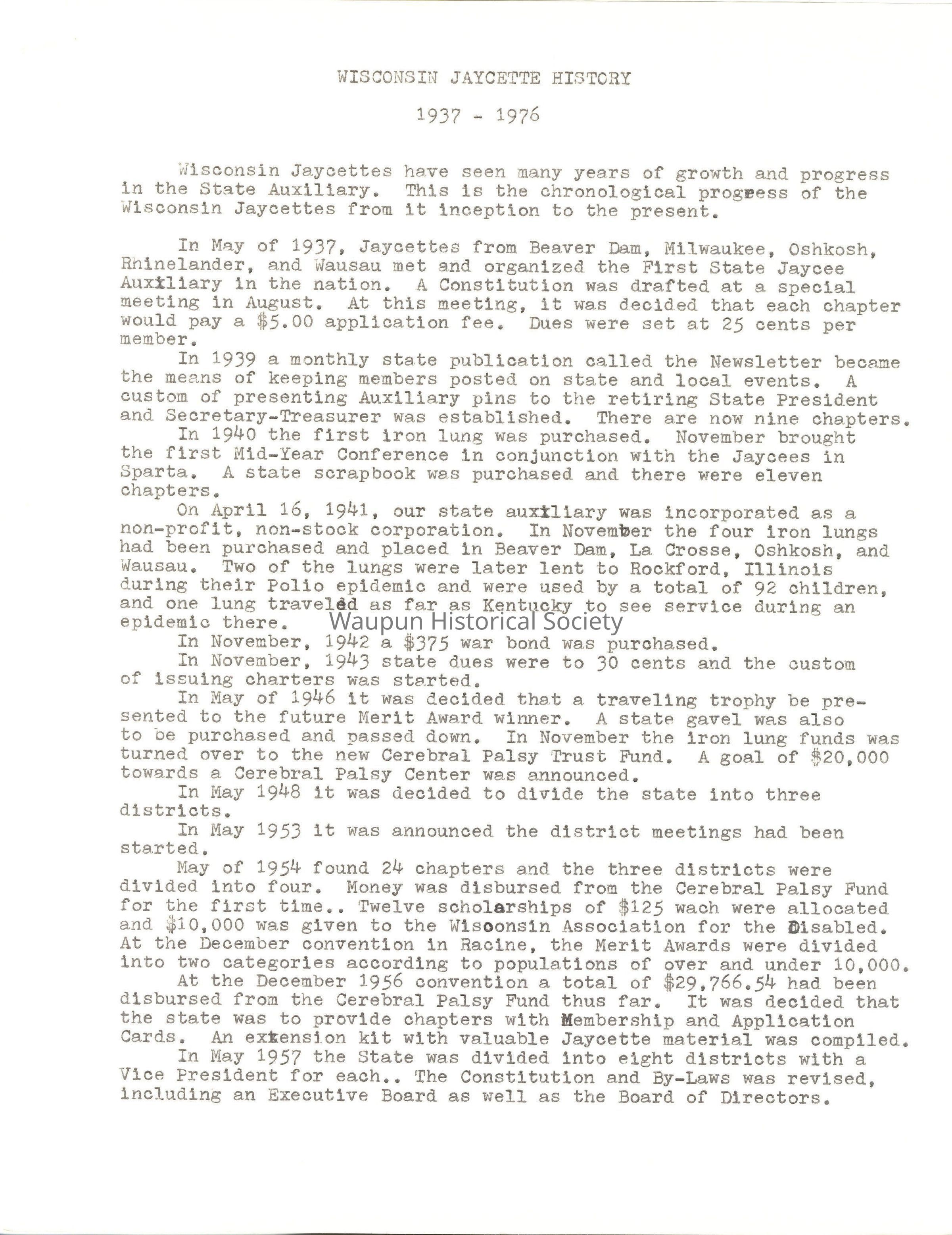 WISCONSIN JAYCETTE HISTORY - 1937 - 1976