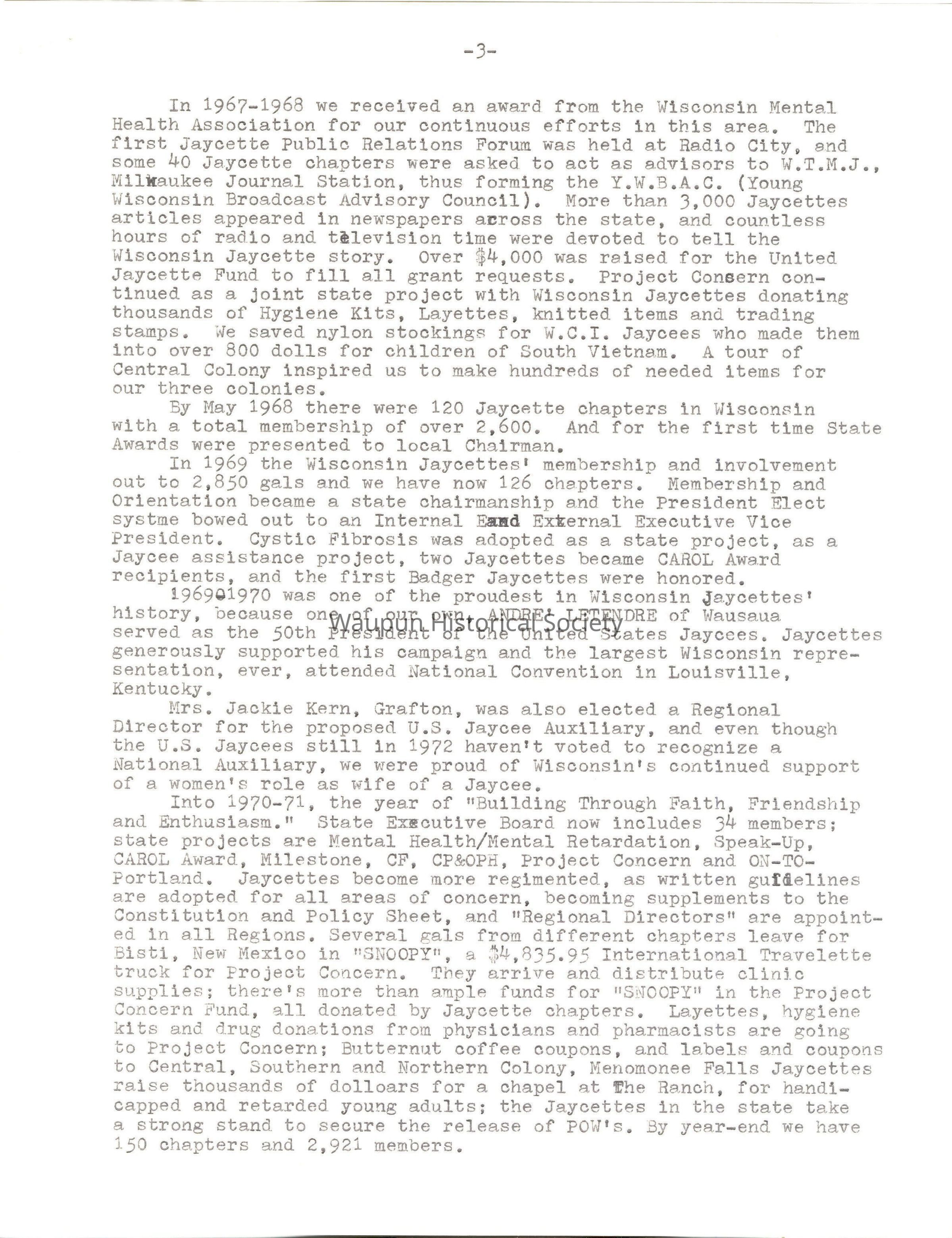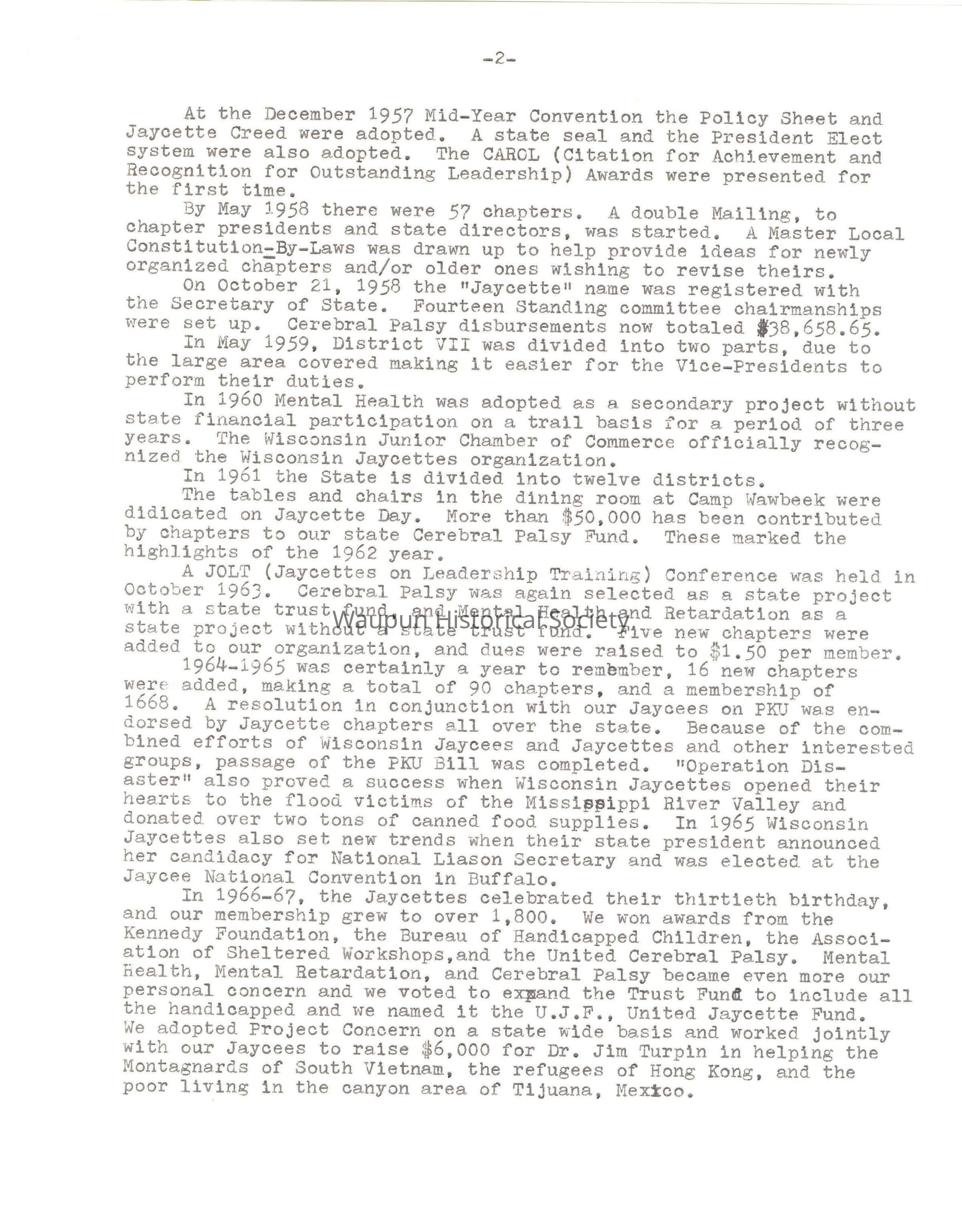 Wisconsin Jaycettes have seen many years of growth and progress in the State Auxiliary. This is the chronological progress of the Wisconsin Jaycettes from it inception to the present.
