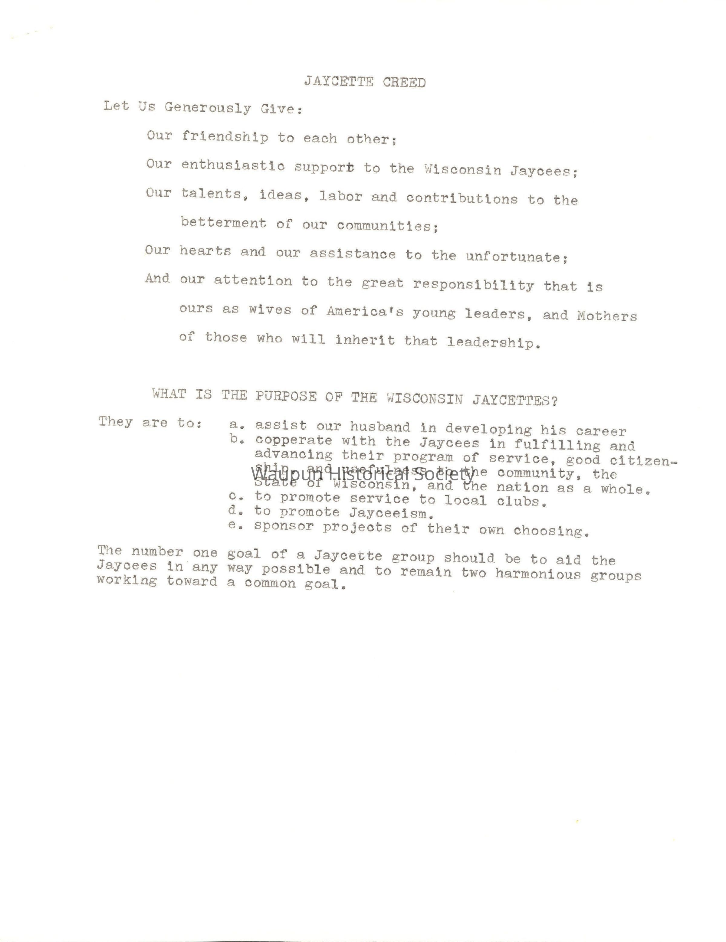 Our enthusiastic support to the Wisconsin Jaycees; Our talents, ideas, labor and contributions to the betterment of our communities;