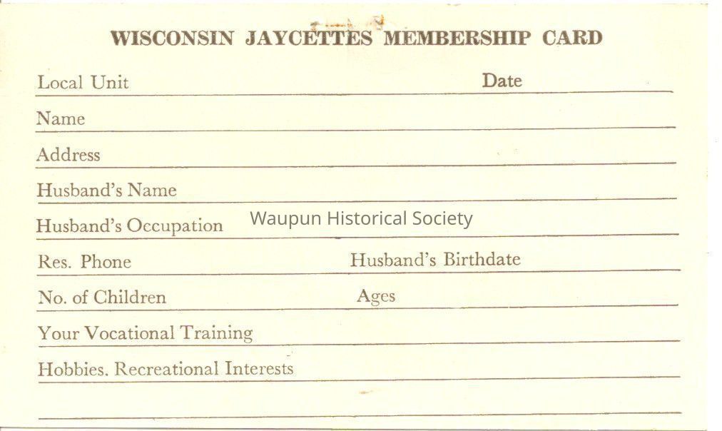 Two sided 3"x5" Wisconsin Jaycettes Membership Card. WISCONSIN JAYCETTES MEMBERSHIP CARD