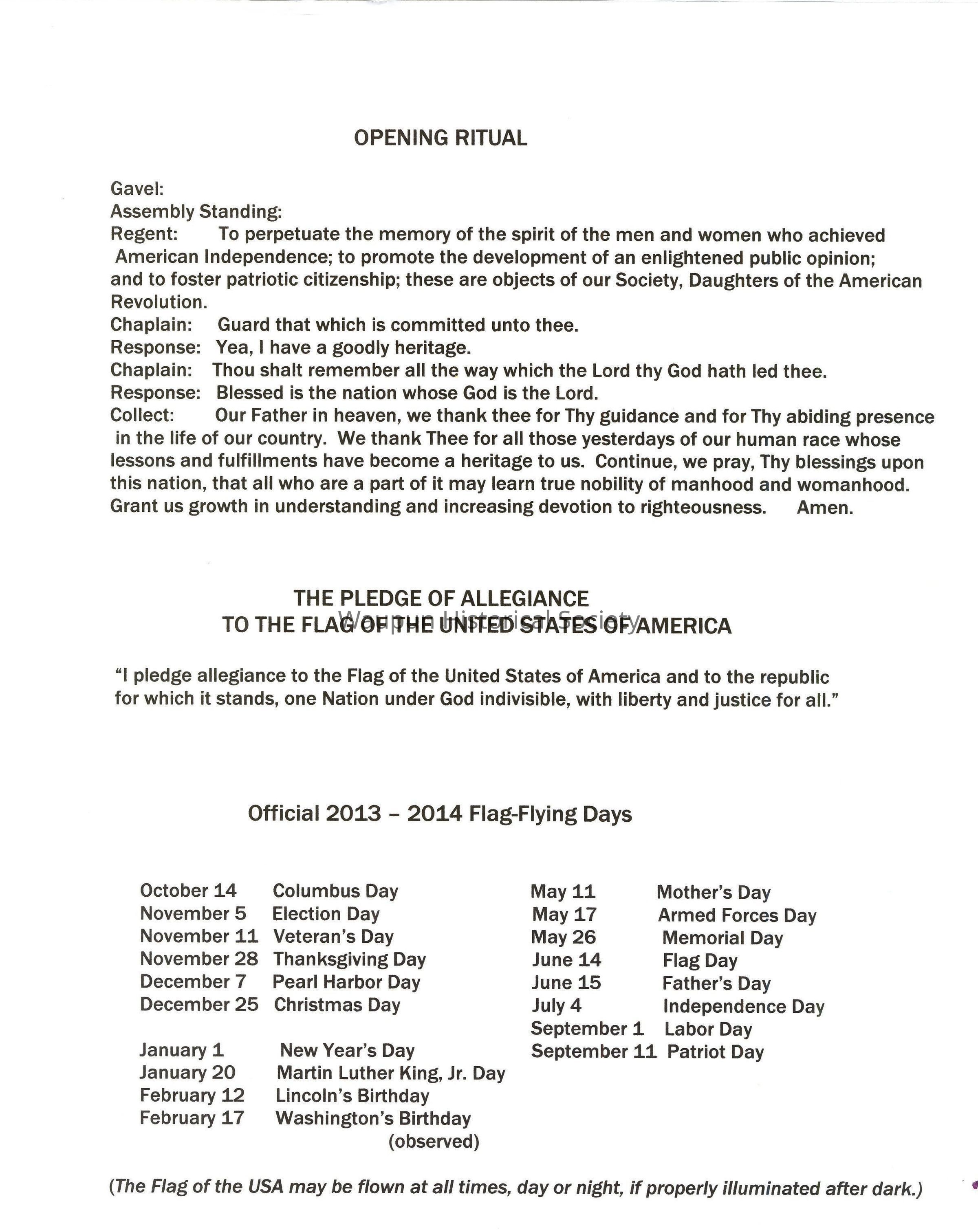 Regent: To perpetuate the memory of the spirit of the men and women who achieved American Independence; to promote the development of an enlightened public opinion; and to foster patriotic citizenship; these are objects of our Society, Daughters of the American Revolution.