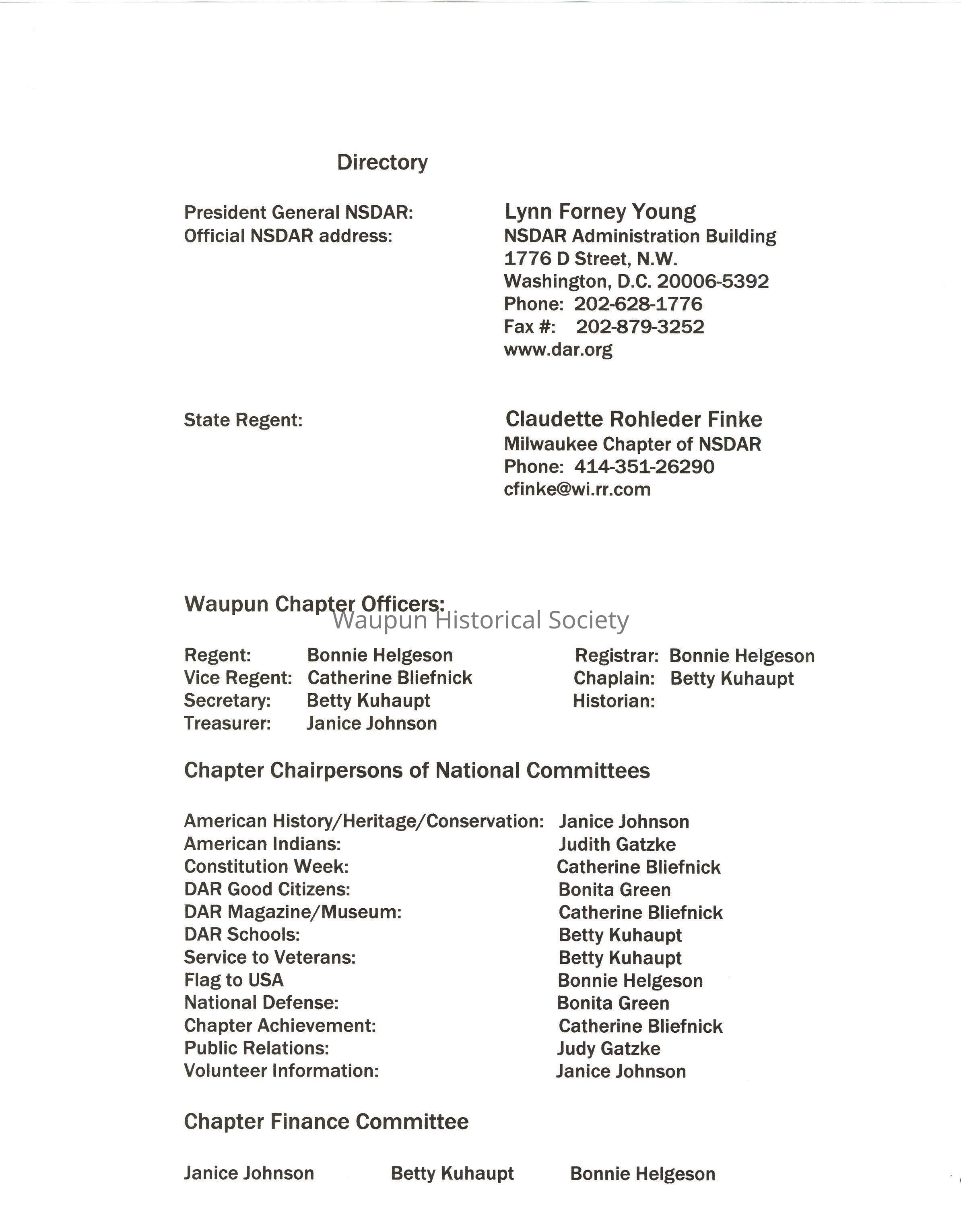 State Regent: Claudette Rohleder Finke, Milwaukee Chapter of NSDAR, Phone: 414-351-26290, cfinke@wi.rr.com