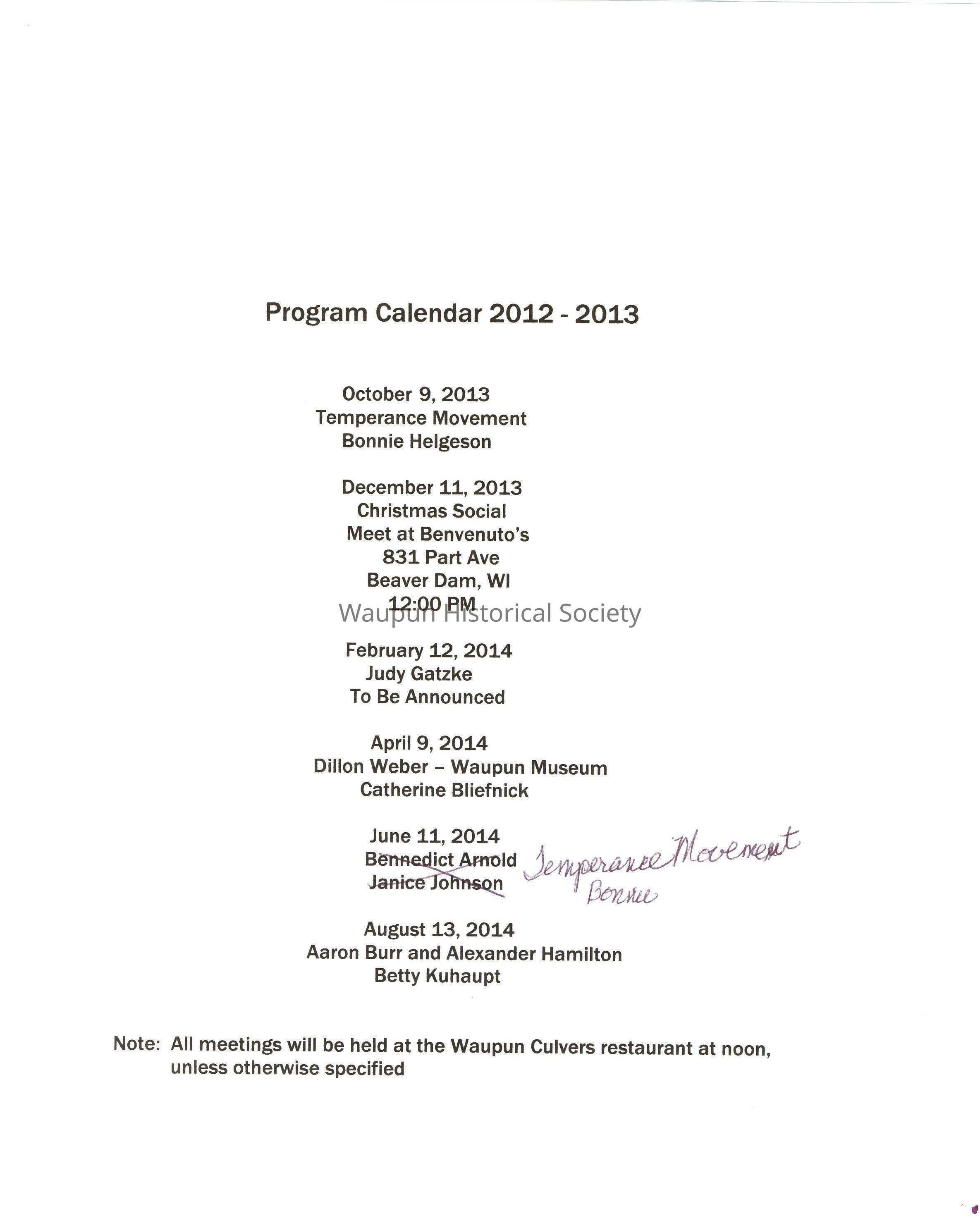 Note: All All meetings will be held at the Waupun Culvers restaurant at noon, unless otherwise specified