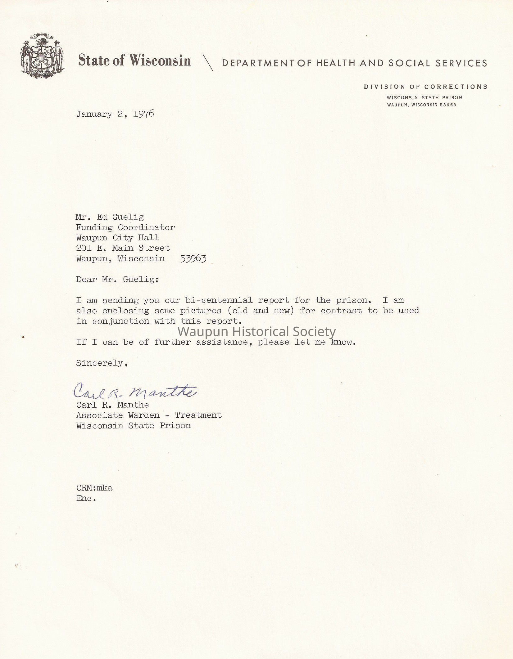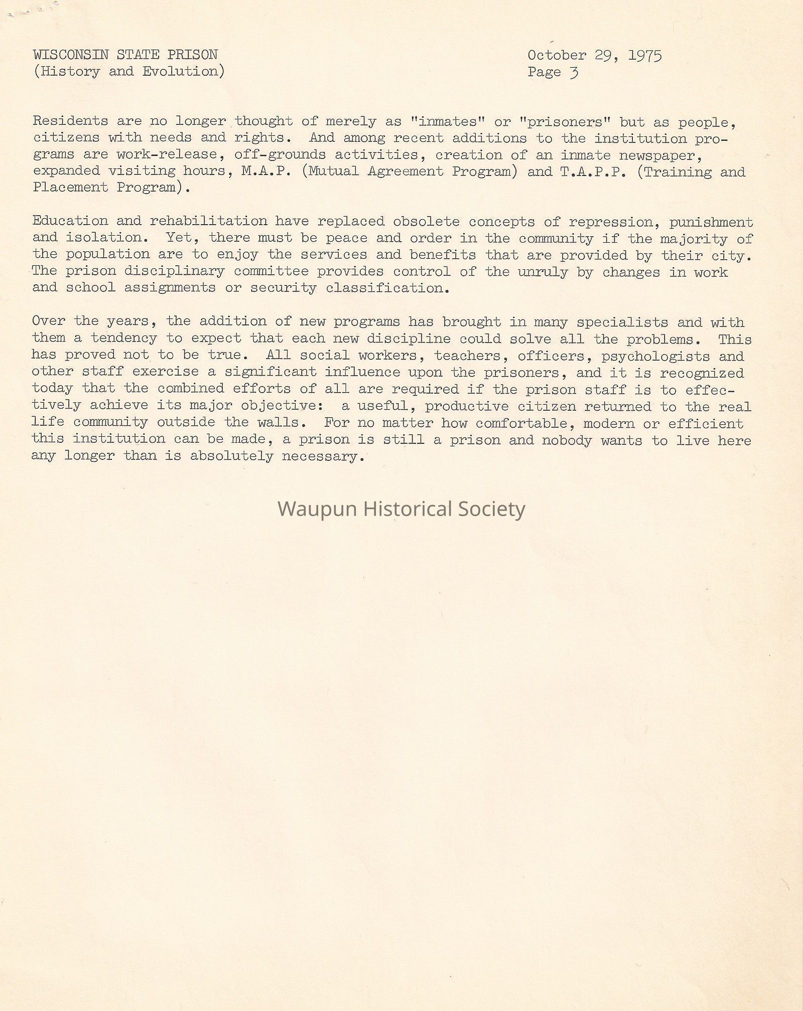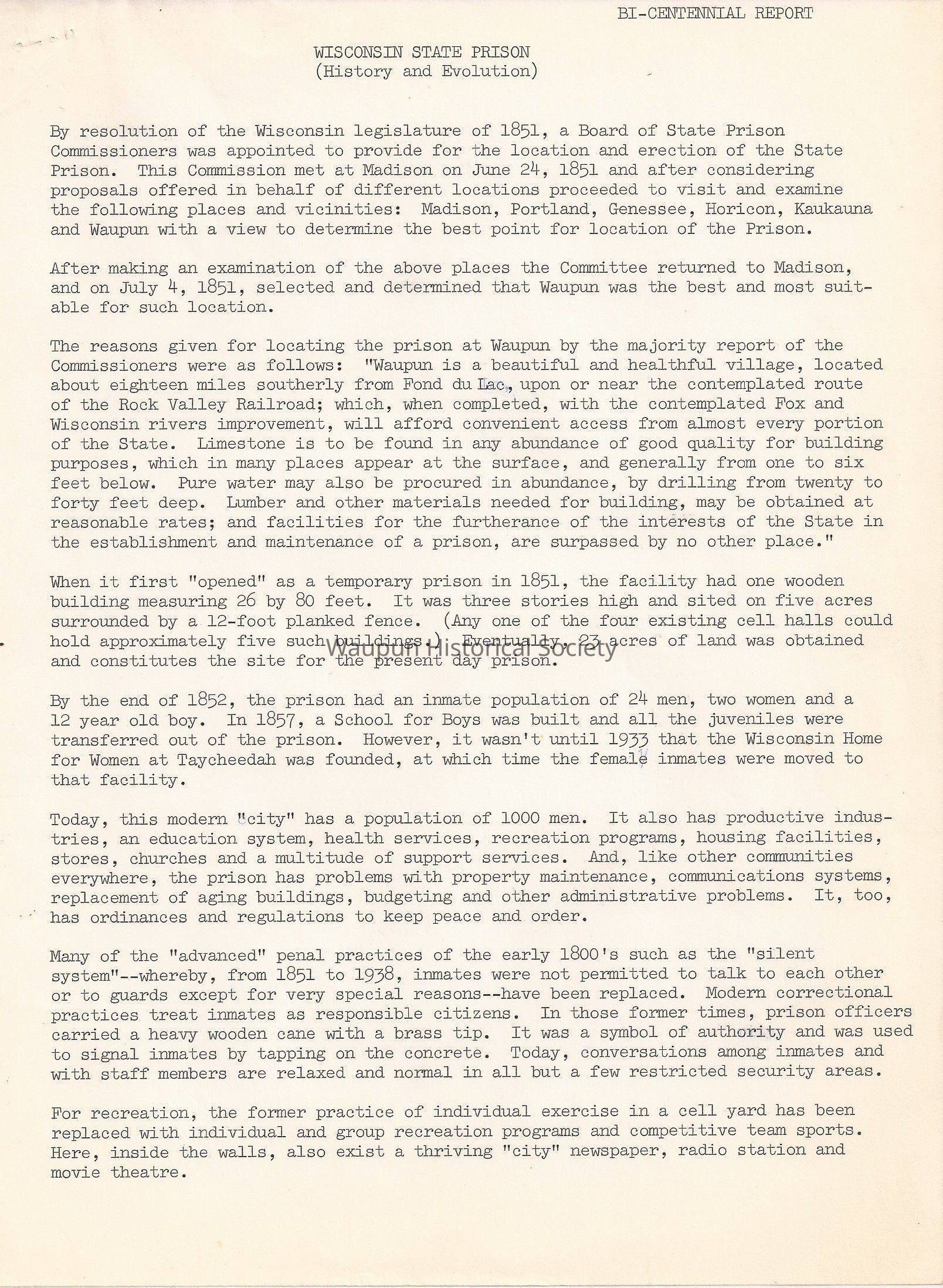 Historical information on Wisconsin State Prison for 1976 Bicentennial Celebration in Waupun, WI.