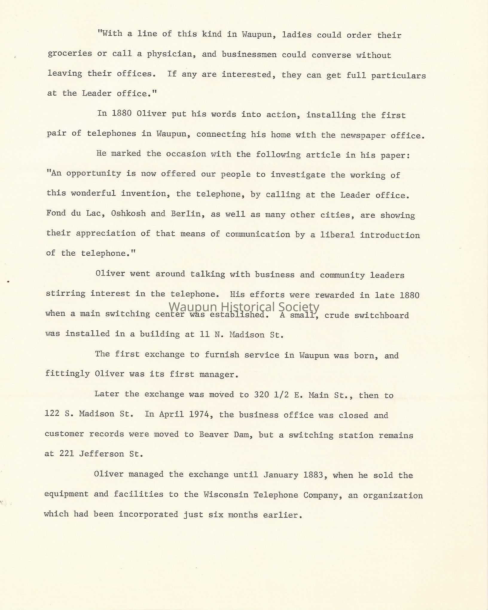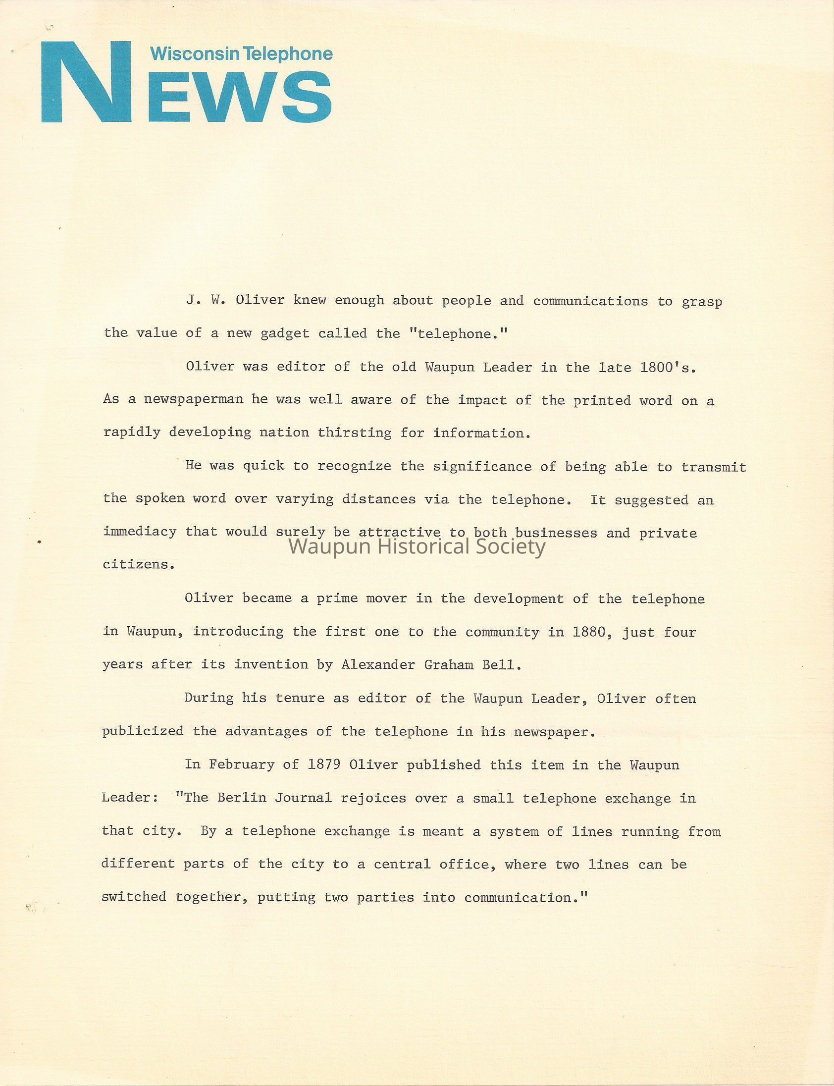 In February of 1879 Oliver published this item in the Waupun Leader: "The Berlin Journal rejoices over a small telephone exchange in that city. By a telephone exchange is meant a system of lines running from different parts of the city to a central office, where two lines can be switched together, putting two parties into communication."