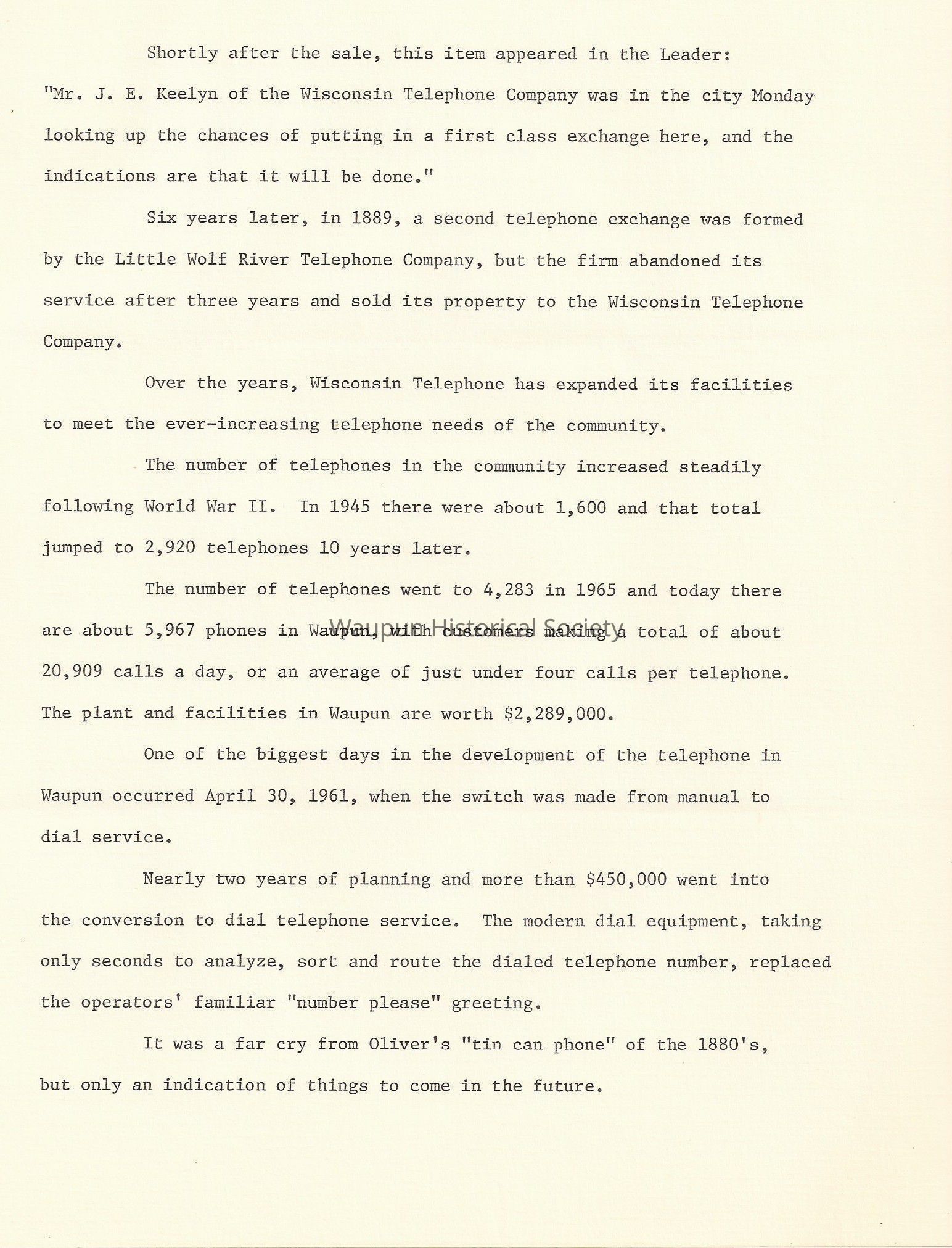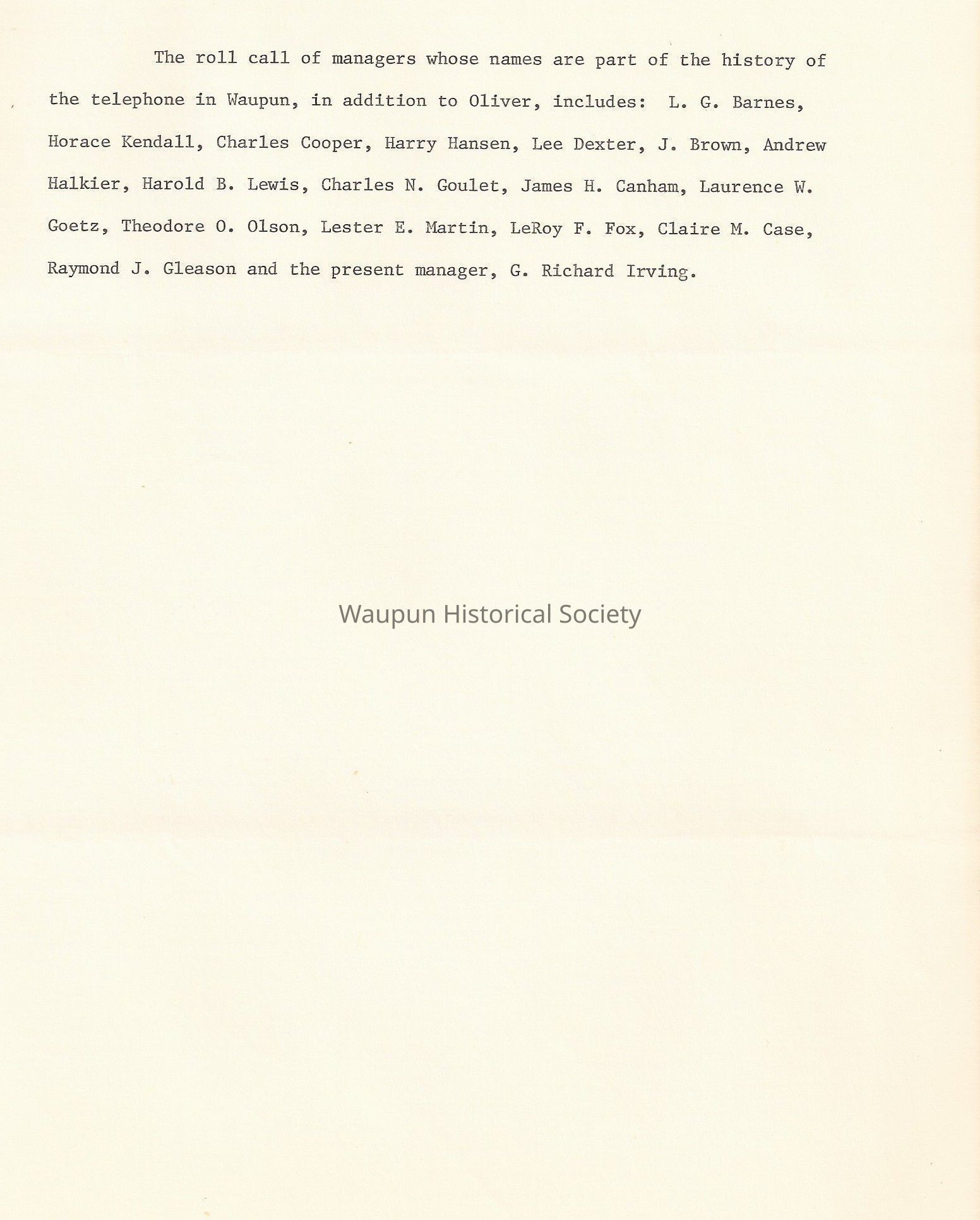 The roll call of managers whose names are part of the history of the telephone in Waupun, in addition to Oliver, includes: L. G. Barnes, Horace Kendall, Charles Cooper, Harry Hansen, Lee Dexter, J. Brown, Andrew Halkier, Harold B. Lewis, Charles N. Goulet, James H. Canham, Laurence W. Goetz, Theodore O. Olson, Lester E. Martin, LeRoy F. Fox, Claire M. Case, Raymond J. Gleason and the present manager, G. Richard Irving.Acquisition