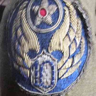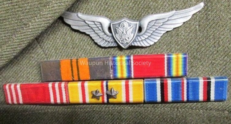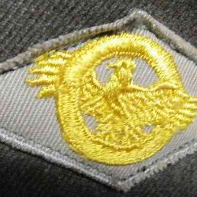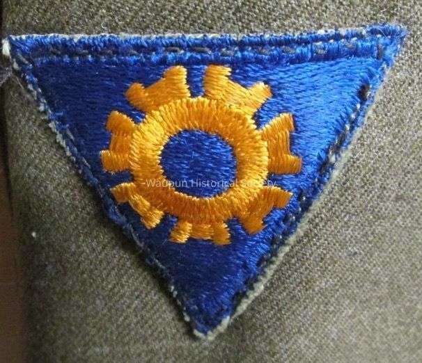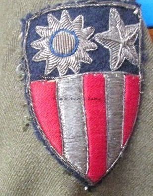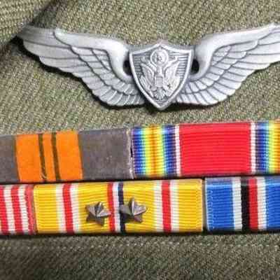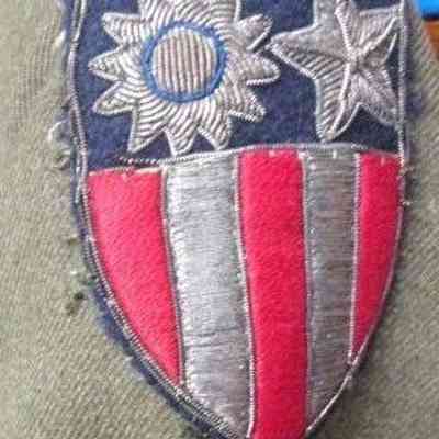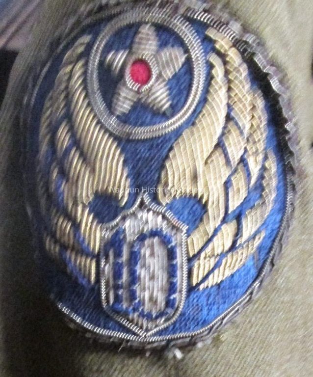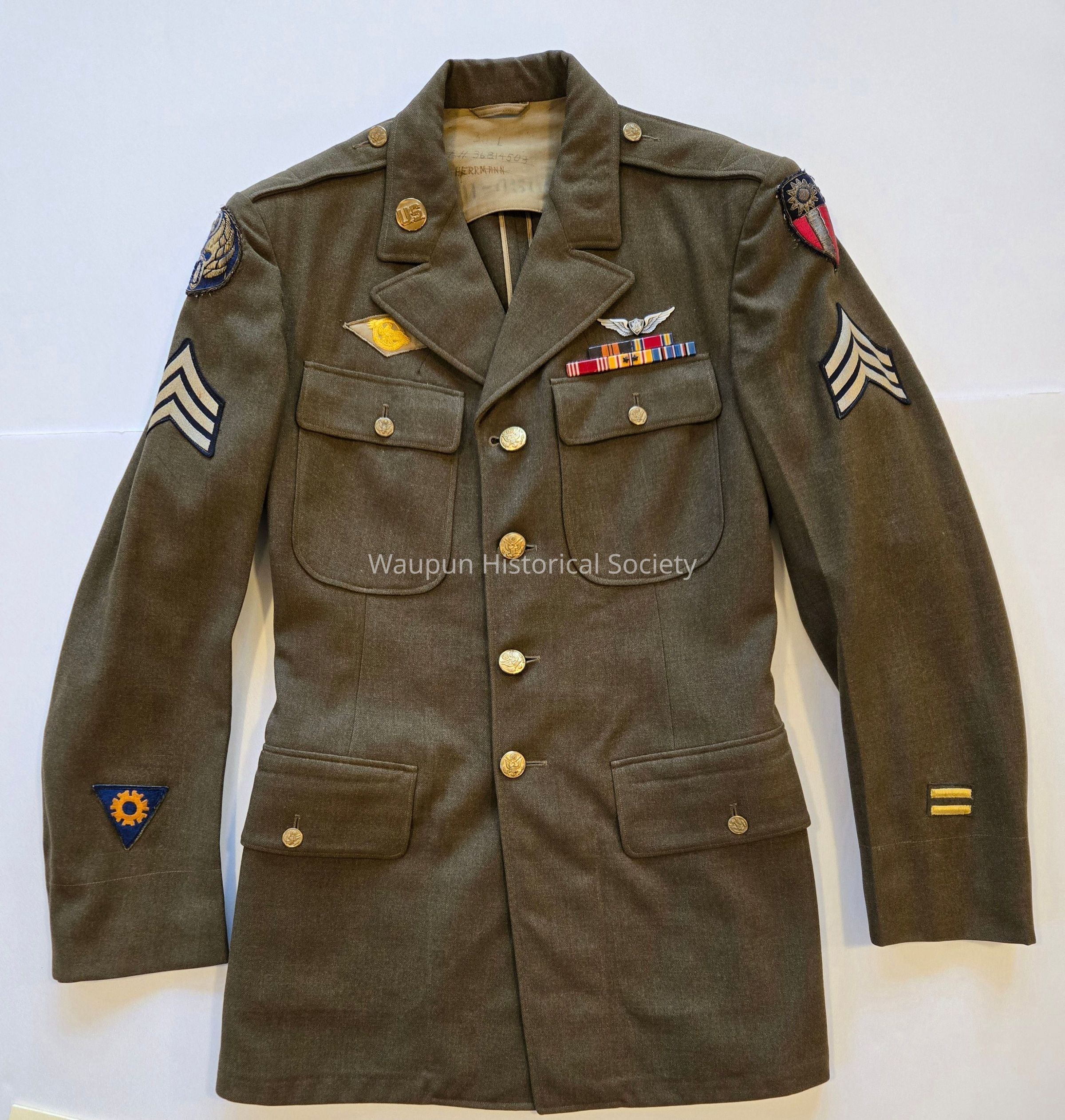 WW II US Army Air Corps uniform Jacket only. Worn by Edwin F. Hermann from April 1943 to March 1946. Adorned by 3 patches on Right arm and 3 patches on left arm. Left Shoulder patch is round, blue and has wings, below is a 3 chevron rank patch and on the cuff of sleeve is an Engineering Specialist Patch. On the Left Shoulder is a China, Burma, India USAAC patch, below the first patch is a 3 chevron rank patch and nearer to the cuff is a 2 bar patch. Front of Jacket carries a WW II diamond shape patch with an eagle on it. Over the left front pocket are numerous ribbons awarded to the wearer of this uniform along with a silver wing pin designating US Air Force.Acquisition