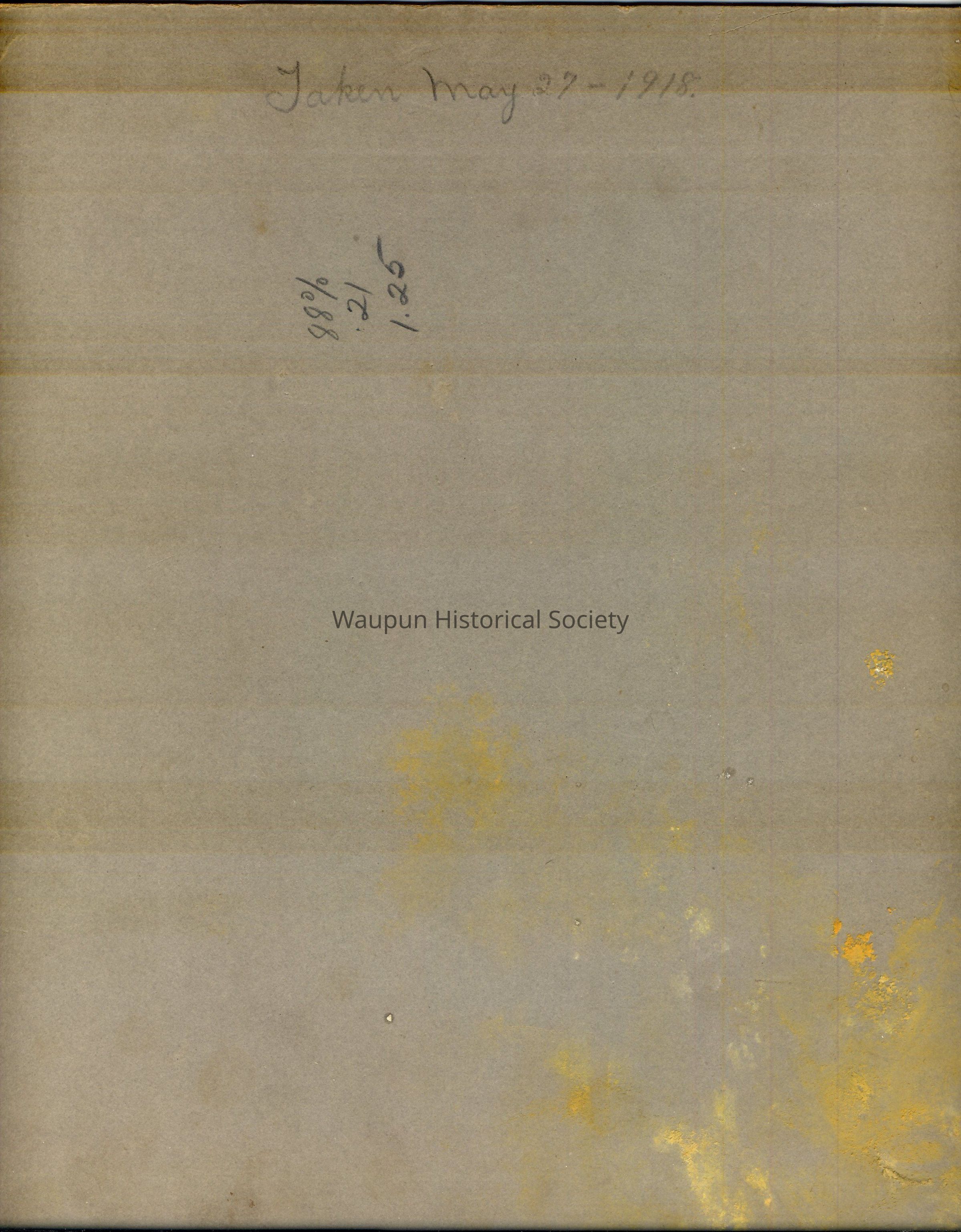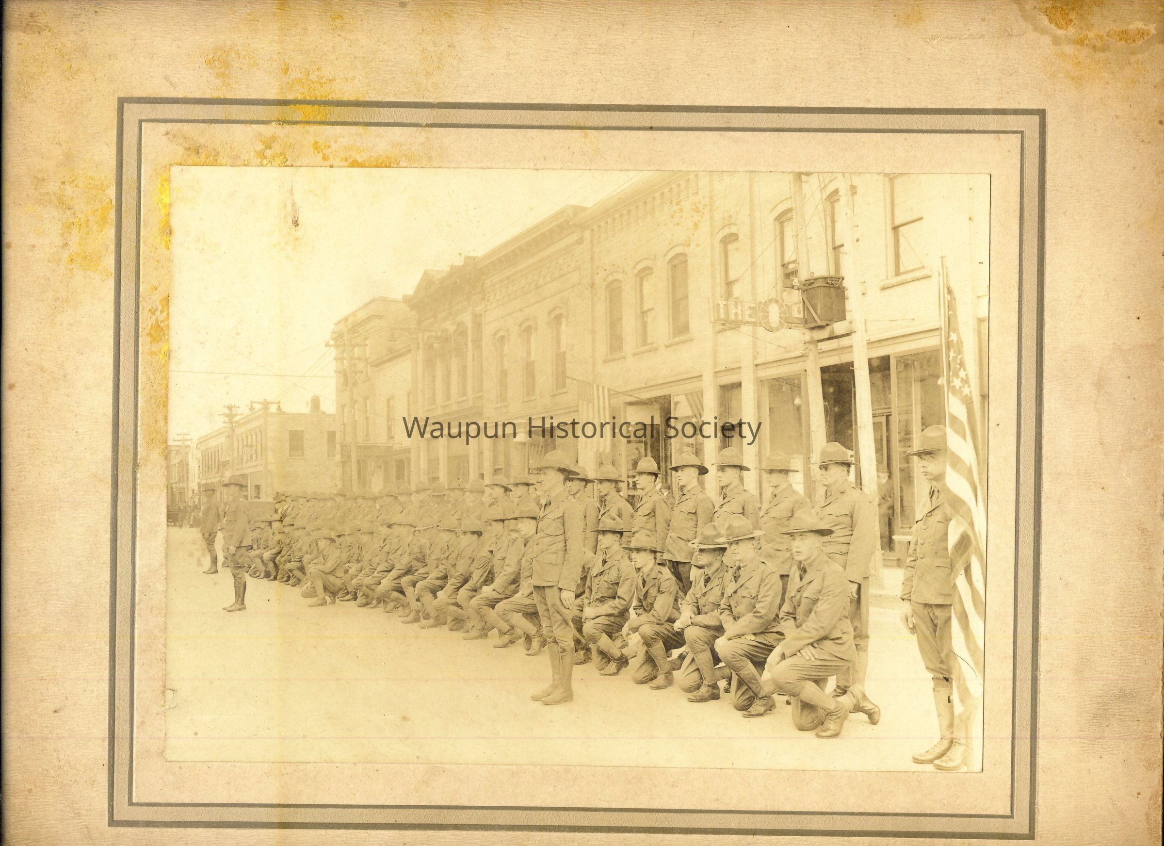 Black and white photo taken May 27, 1918, of WWI soldiers on a street in Waupun, WI. We know this is the correct date due to fact that it is handwritten on back of photo.Acquisition