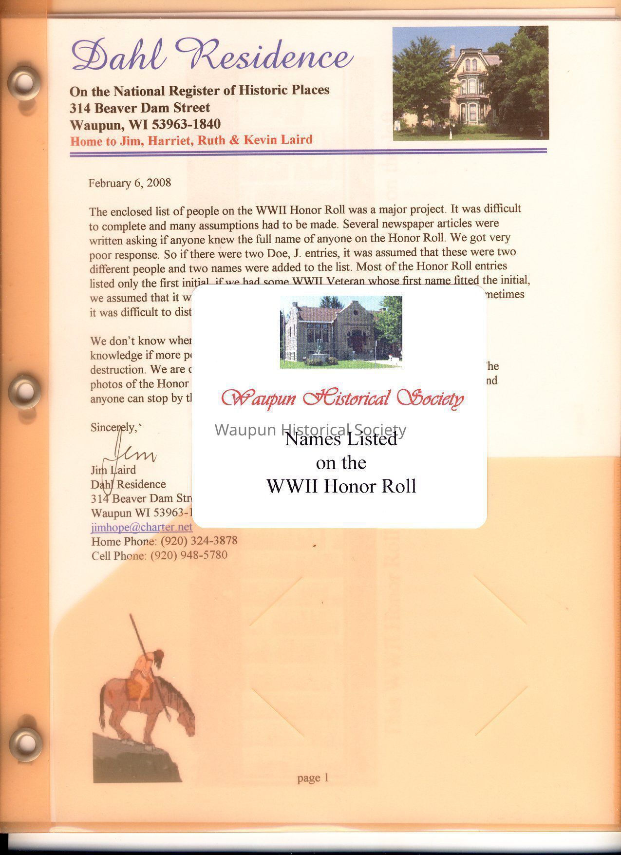 Listing of the enscriptions on the WWII Honor Roll. This listing was made from the photograph of the WWII Honor Roll that is in the Military Room. Jim Laird made this listing on his home computer.
