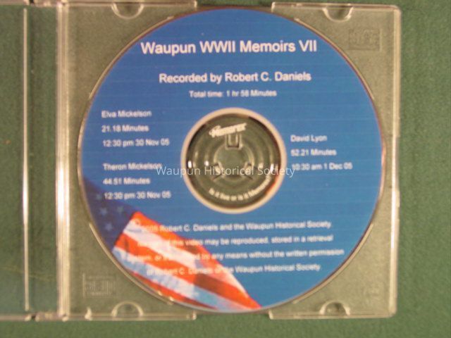 WWII Recordings: Recorded interviews / memoirs of Waupun WWII Veterans, recorded by Robert C. Daniels and donated to the Waupun Historical Society.Originals are stored at City Hall, Copies are stored on main floor near DVD player.