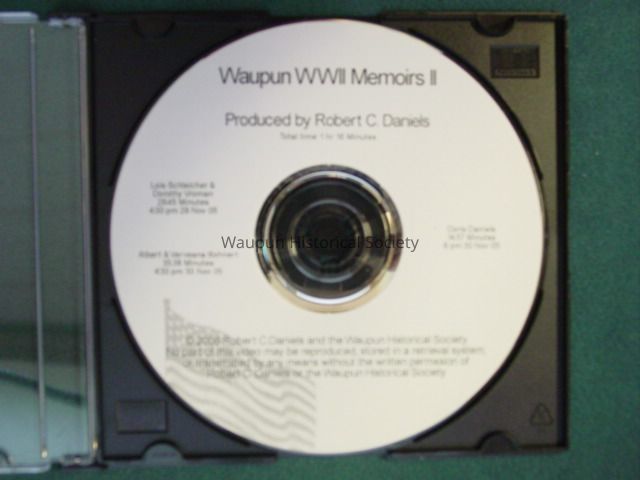 WWII Recordings: Recorded interviews / memoirs of Waupun WWII Veterans, recorded by Robert C. Daniels and donated to the Waupun Historical Society.Originals are stored at City Hall, Copies are stored on main floor near DVD player. Copy of 2005.0025.0002
