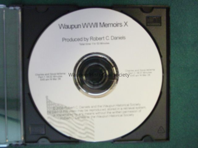 WWII Recordings: Recorded interviews / memoirs of Waupun WWII Veterans, recorded by Robert C. Daniels and donated to the Waupun Historical Society.Originals are stored at City Hall, Copies are stored on main floor near DVD player. Copy of 2005.0025.0010