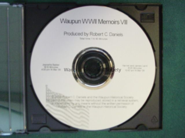 WWII Recordings: Recorded interviews / memoirs of Waupun WWII Veterans, recorded by Robert C. Daniels and donated to the Waupun Historical Society.Originals are stored at City Hall, Copies are stored on main floor near DVD player. Copy of 2005.0025.0008