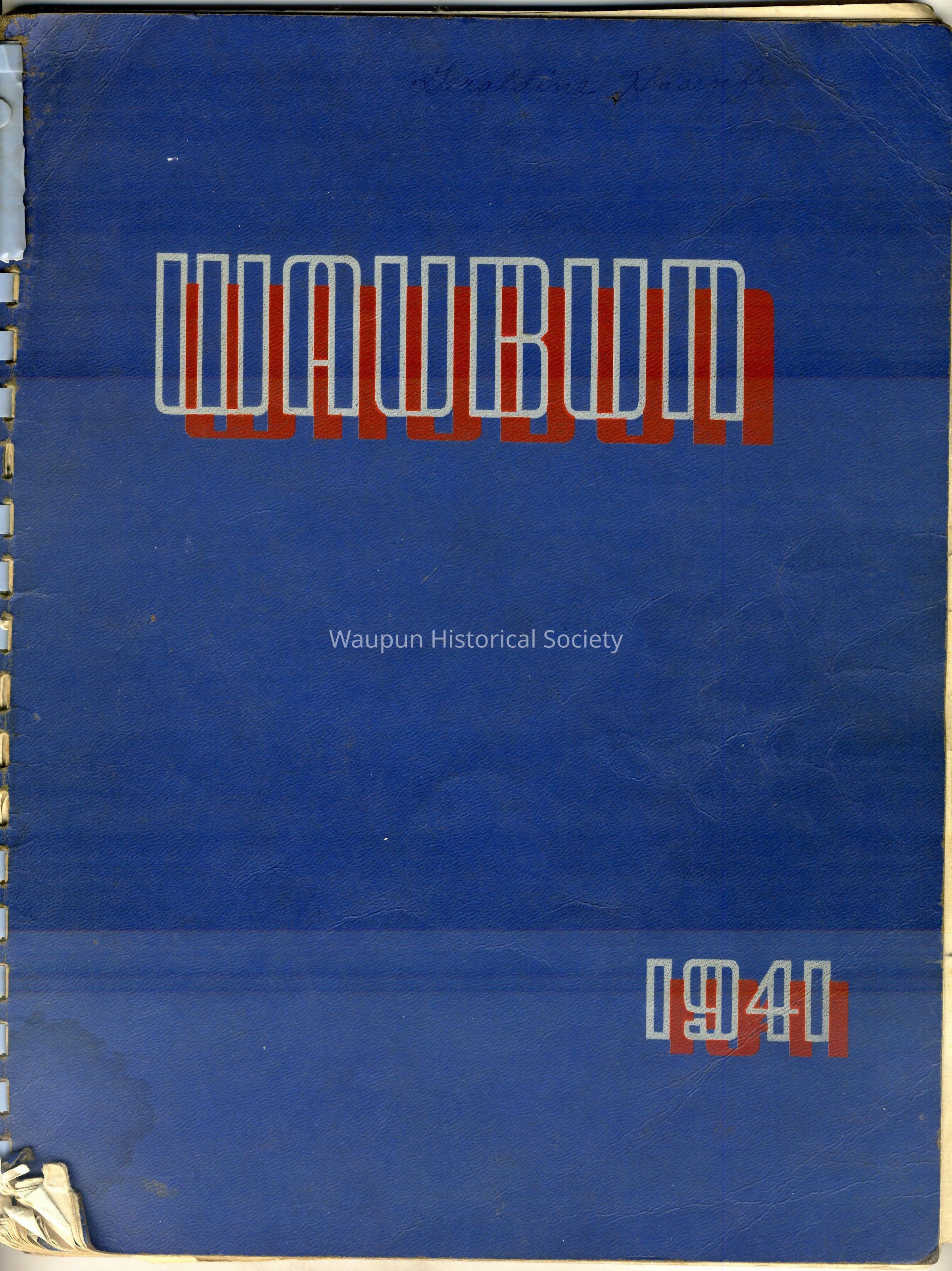 1941 WAUBUN yearbook from Geraldine Hasenfus; dark blue with red and white lettering. It is bound by a blue plastic spiral which is broken in sections causing pages to be loose in the book.Acquisition