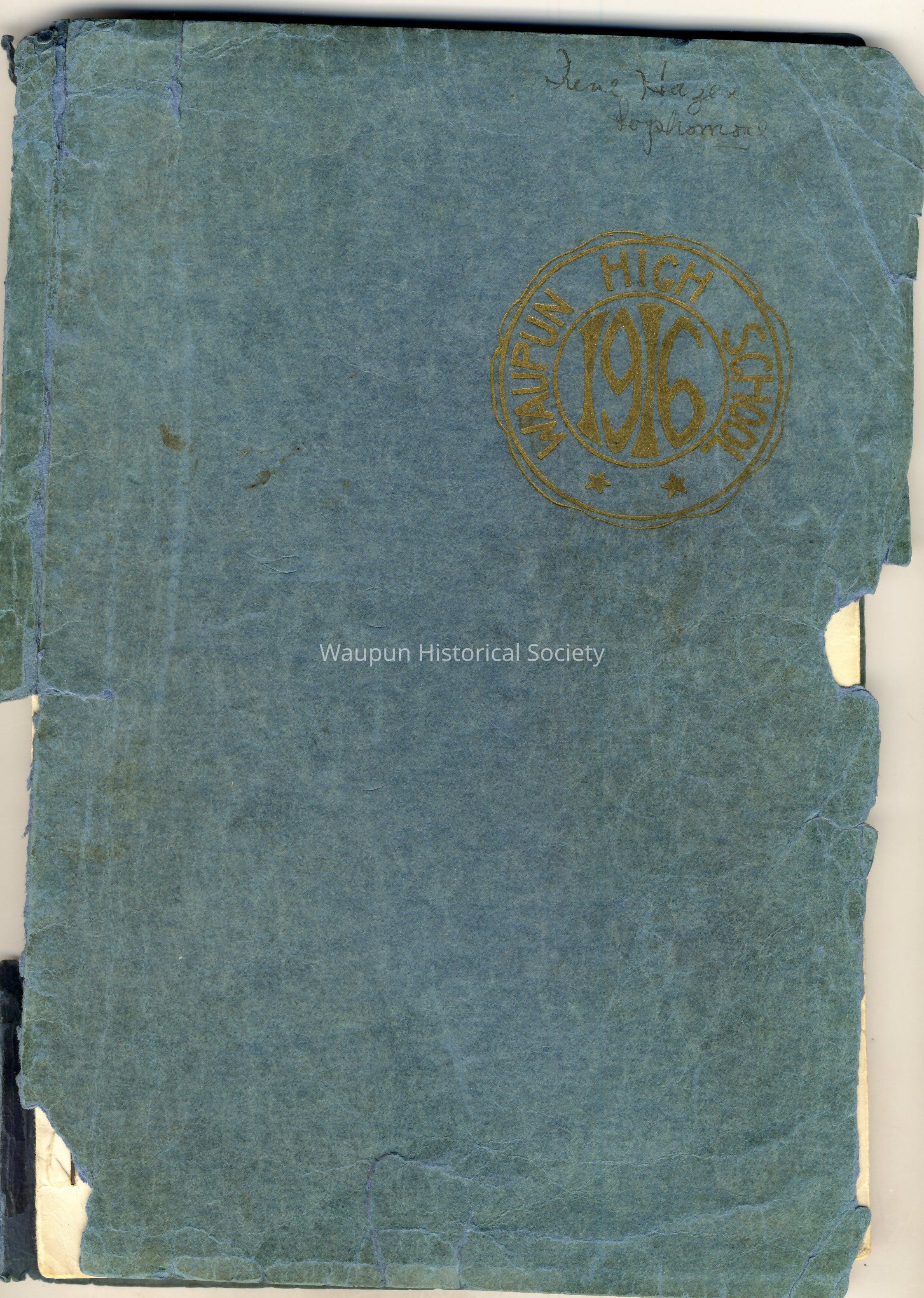 1916 Waupun High School Yearbook - The name June Hazen, Sophmore is handwritten on the front paper cover. This was donated by Virginia Fellman of Fond du Lac, WI. The front and back covers are loose and very tattered. The whole book is held together with 3 large staples.Acquisition
