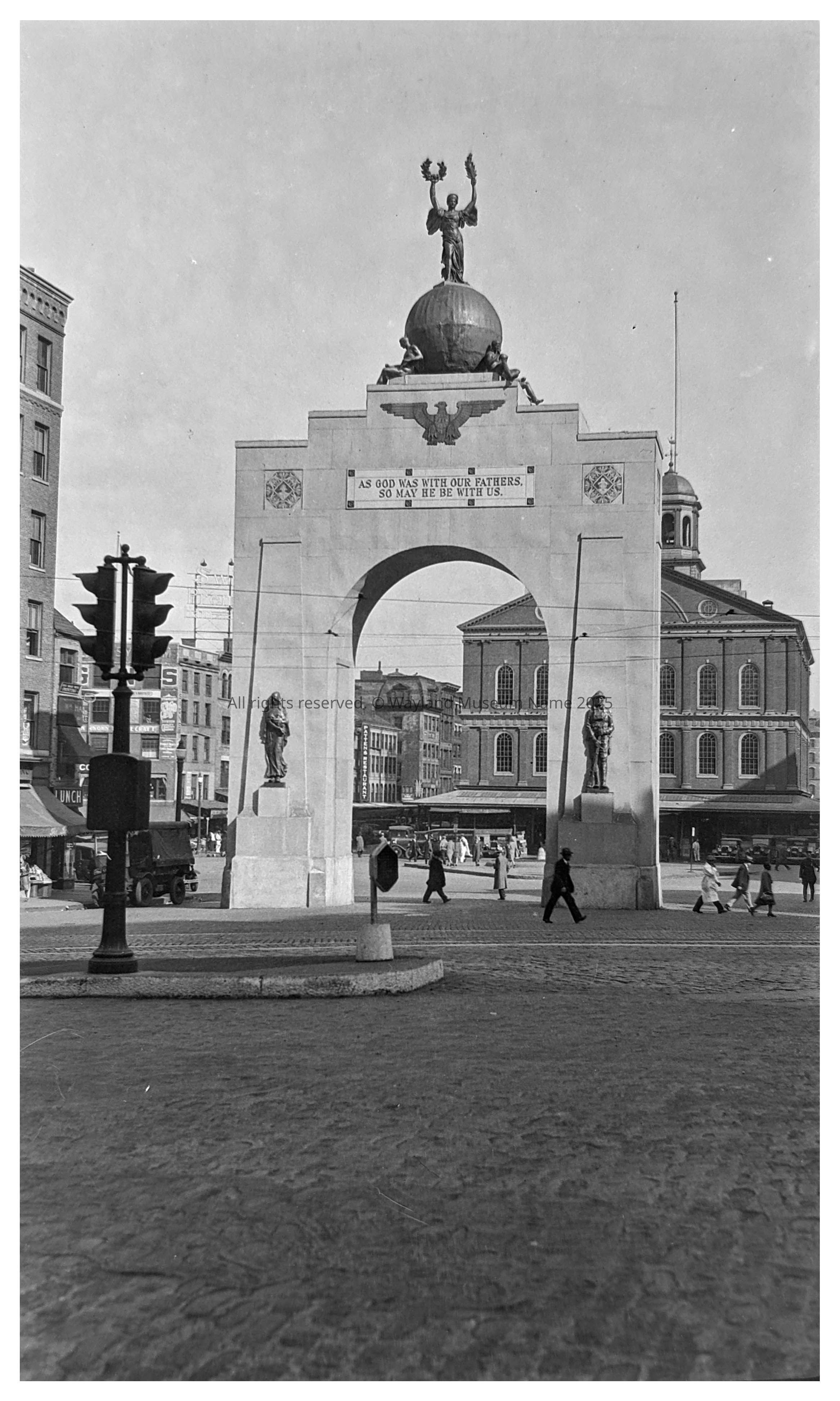 In September 1930, Boston erected a Victory Arch to celebrate 300 years since the founding of Massachusetts Bay Colony. Parades passed through Dock Square, past Faneuil Hall—the so-called "Cradle of Liberty," where colonists debated revolution. The hall was built in 1742 by Peter Faneuil, whose fortune came from the slave trade.