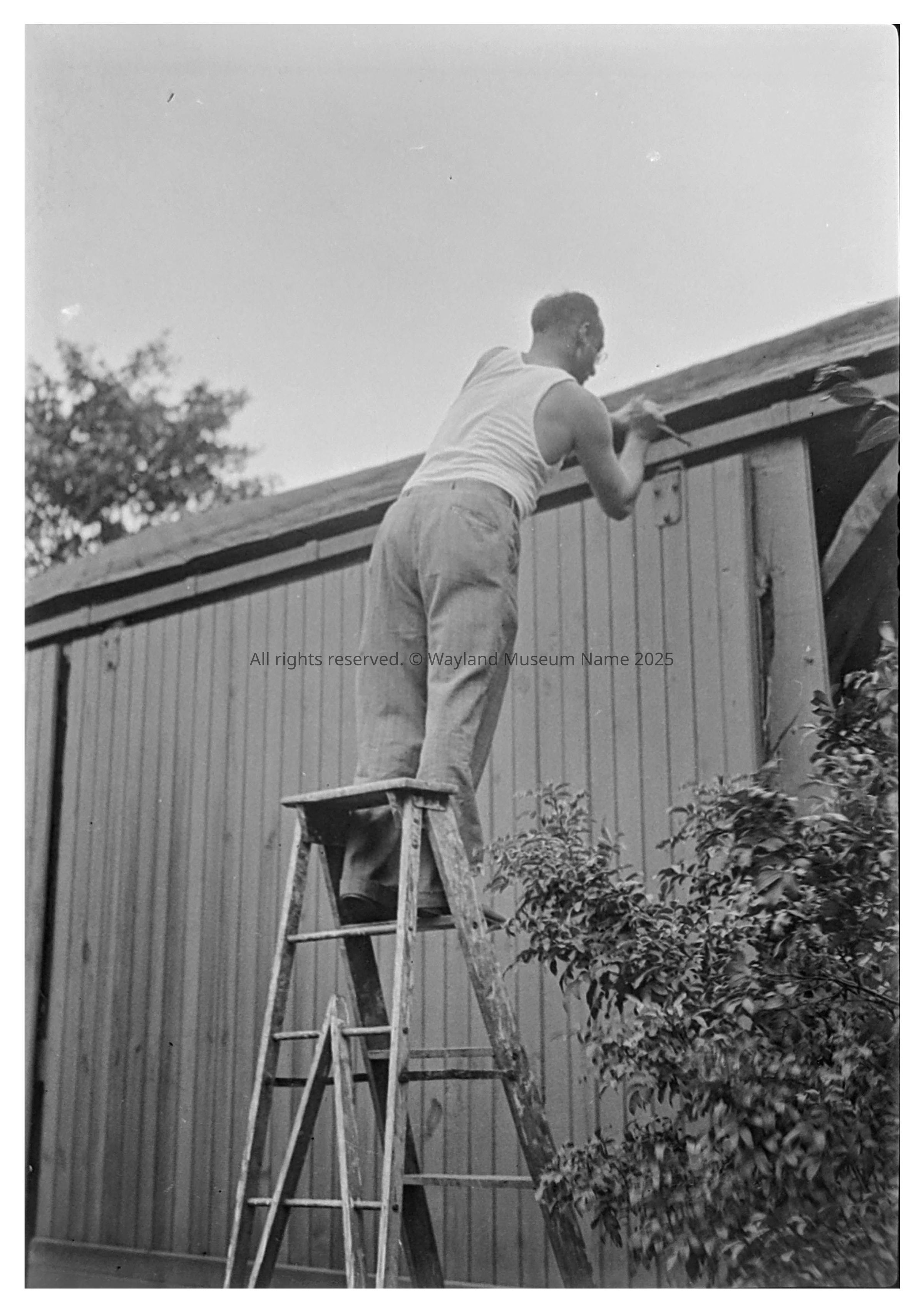 Burbank Philip, Rev. Josiah Bridge house' barn, 47 Old Sudbury Road Josiah Bridge’s sits high above the road and is reported to have been built in ca. 1761. He remained as the preacher at the Fourth Meetinghouse from 1761 to 1801 thus remaining through the time in which east side of the Sudbury River became a separate town from the west side of the Sudbury River in 1780. The next proprietors were William and Aaron Bridge, sons of the Rev. Bridge who lived here from 1801 to 1830 and kept a store in part of the house from 1790 to 1815. Eli Sherman, a farmer, resided here throughout the middle of the nineteenth century and had the largest herd of cows (fourteen), which was very large at that time. Next known owner was John Moulton. The late nineteenth century owner was Alden Wellington who was married to Emma Drury Draper, one of the daughters of James Austin Draper . At that time Draper's land abutted Wellington's land.Photograph Details