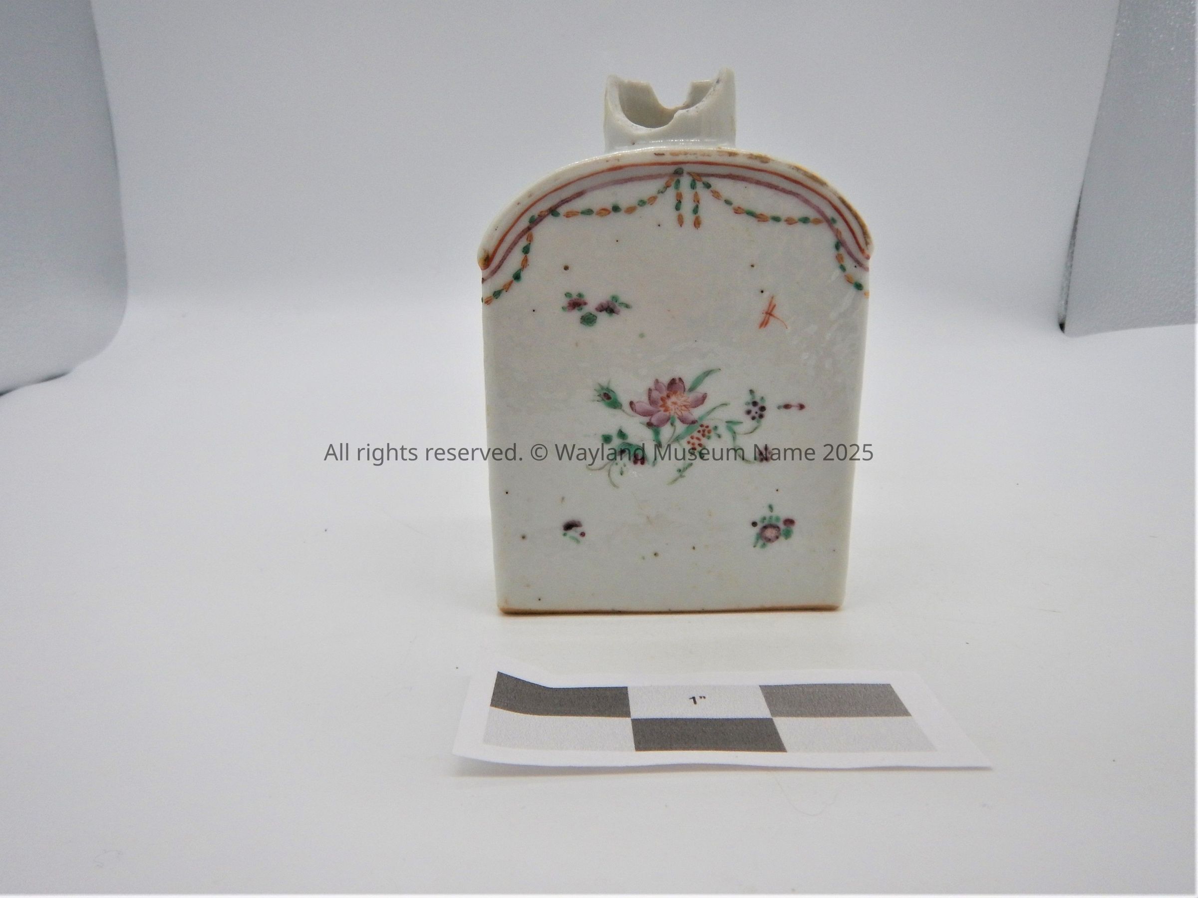 Tea caddy: white, with dainty flowers dotted around, in center a larger spray of pink flowers, at top a garland of tiny pink & green dots, top has dainty flowers & sides, a spray; narrow lines around top in pink & what is left of a gold stripe, shaped like a flat bottle, c.1775.