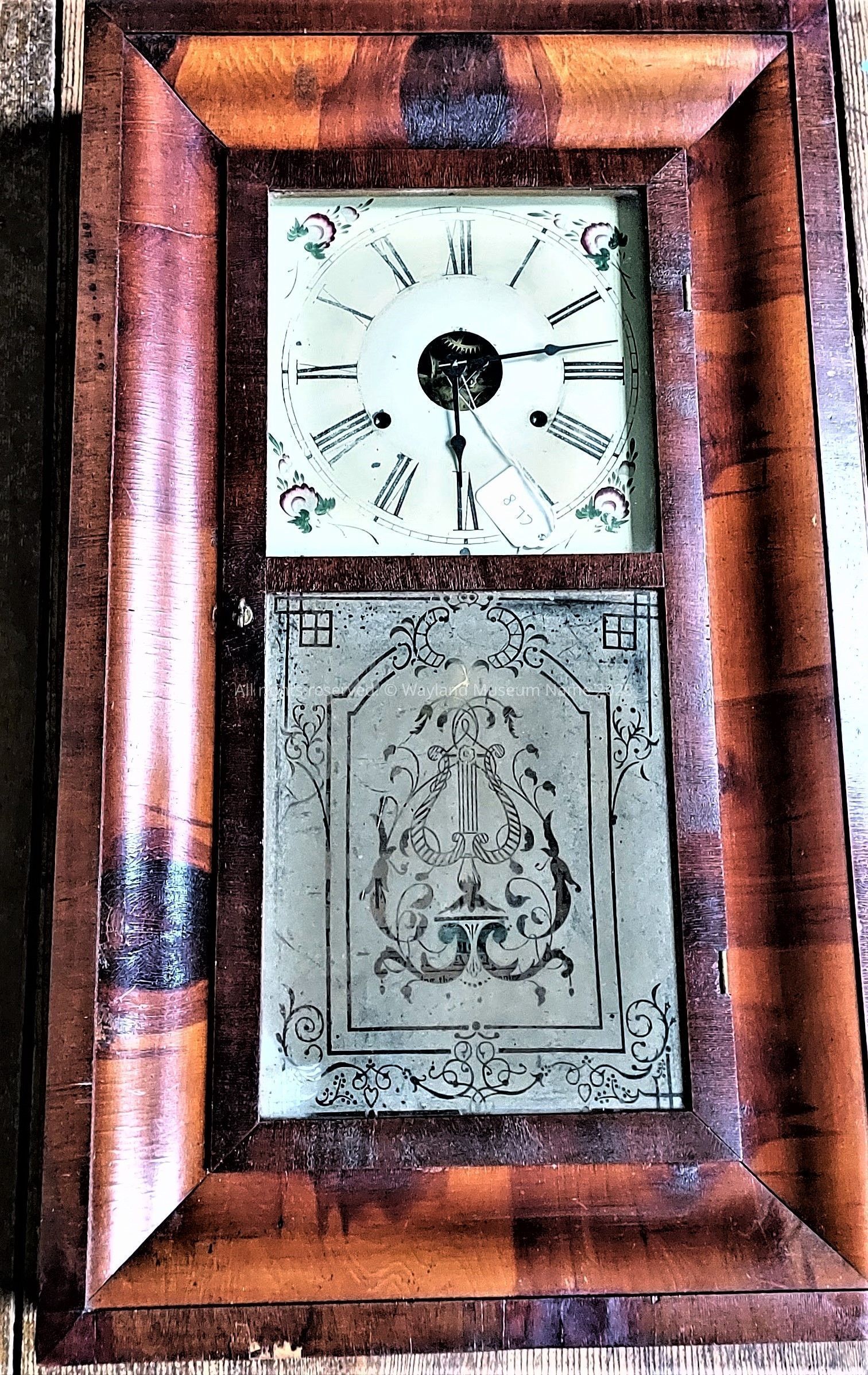 8 day or 30 hour; weight driven; strikes; face has curved surface under numbers; pulleys; lyre etched on the glass.Cataloged By