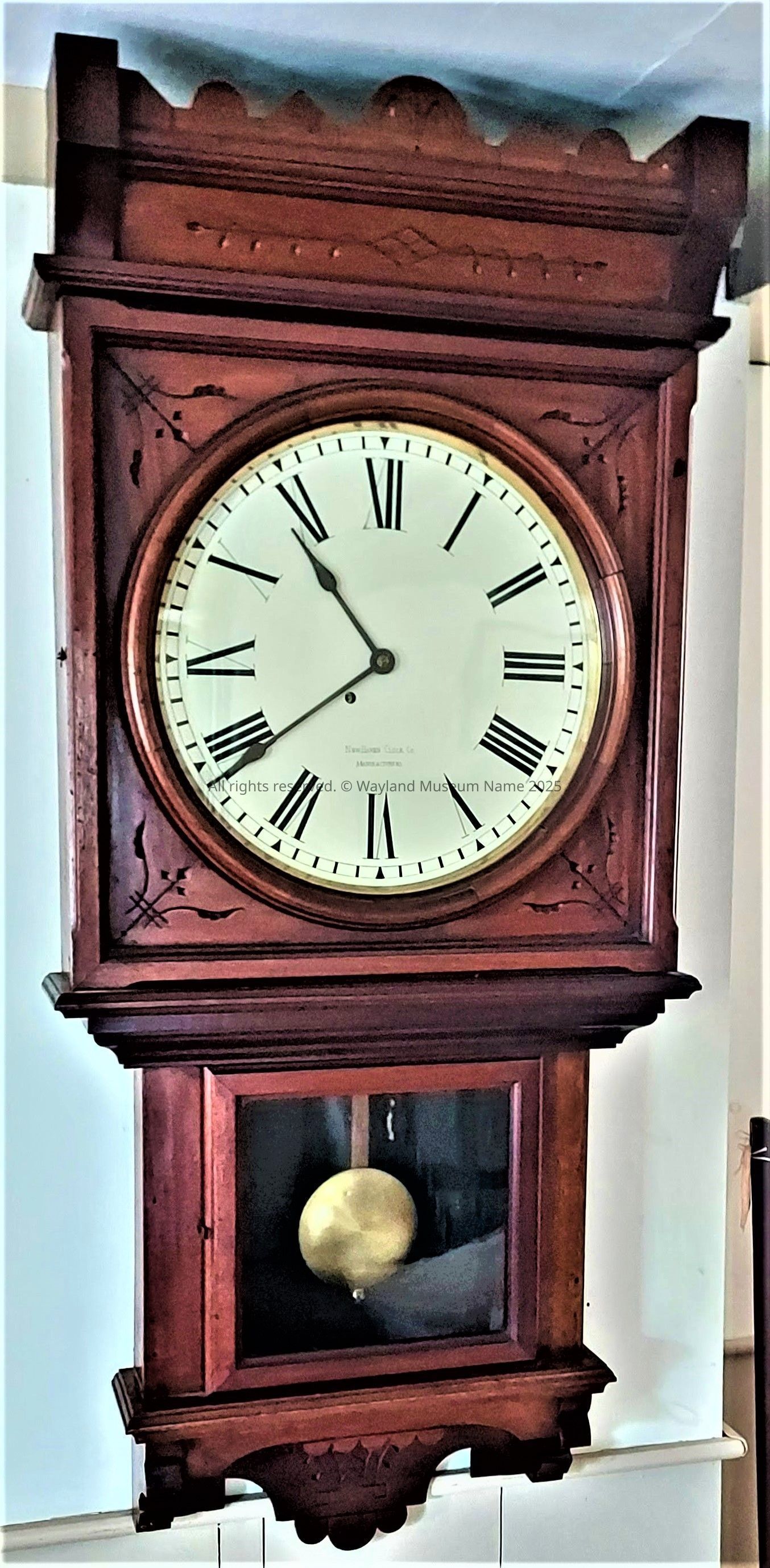 A wall-mounted clock; New Haven Clock Co., Mfg.; 8 day; spring driven; does not strike; made in 1878; no special hand-type; Eastlake style incised decorative carving; wooden pendulum rod, brass disk.Cataloged By