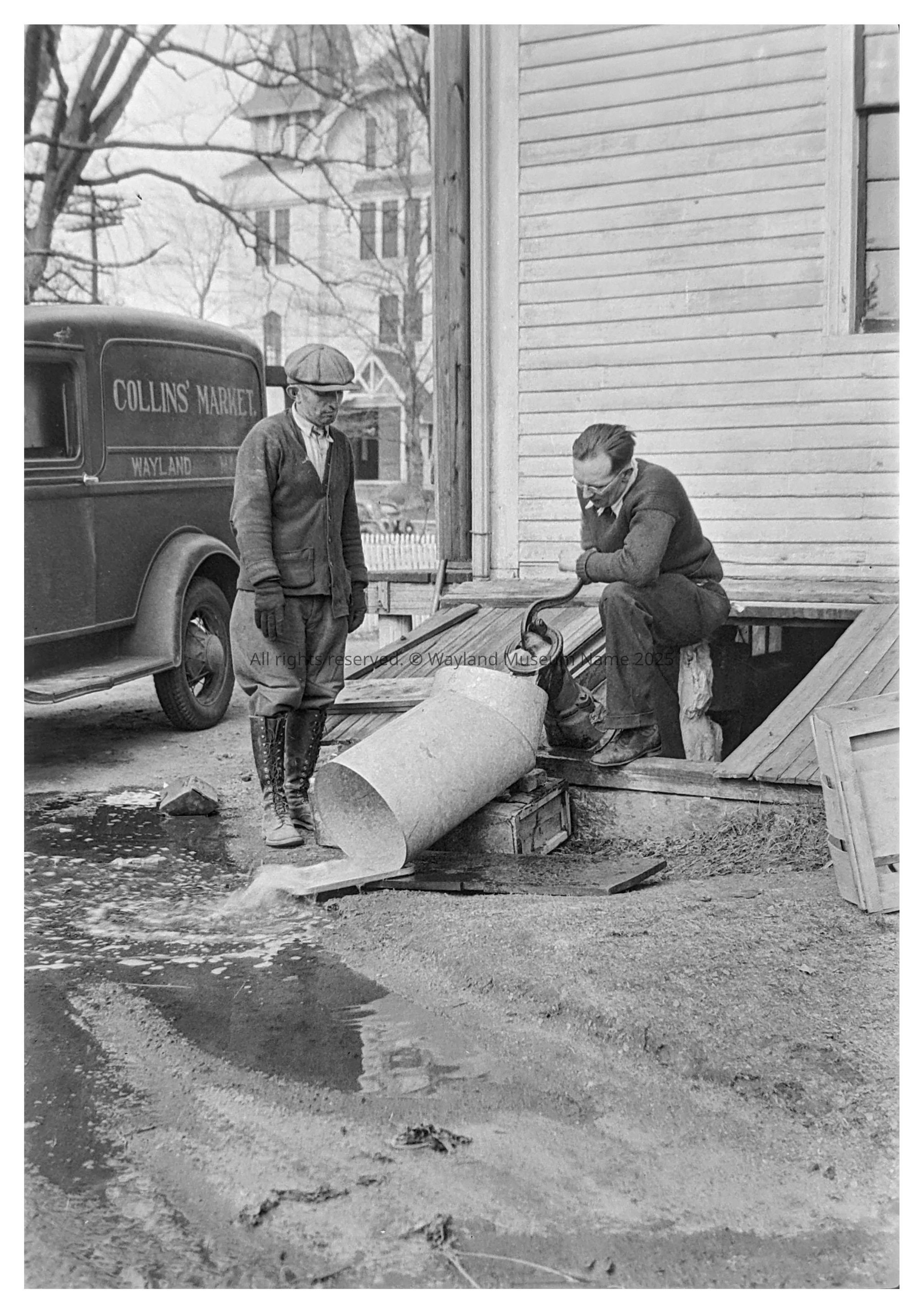 Collins’ Market, cellar door & delivery van; Pumping water out of the cellar door in back of the store. In 1841 the town erected this structure to serve as Wayland’s first municipal building and it was referred to as the Town House. For two years (1841 and 1842) Wayland Academy (a private school) met here in the classroom. After that is was used for a town school. In 1850 the Wayland Free Public Library was opened in the building. Town meetings were held in the upstairs hall from about 1841until 1871. In 1879 it was sold to Lorenzo M. Lovell. He converted the Town House into a dry goods and grocery store for the next 100 + years. About 1922 Lawrence Collins leased the store. The Collins remained here for nearly 60 years and today the building is still referred to as Collins Market. His two sons also worked in the store.The lease arrangement lasted over 30 years, until 1955 when the Lovell family sold the building to Lawrence Collins’ son. It was a meat market and food store into the late 1980s during which time it retained the flavor of an old market with wood floors and a meat counter with butcher.Collection