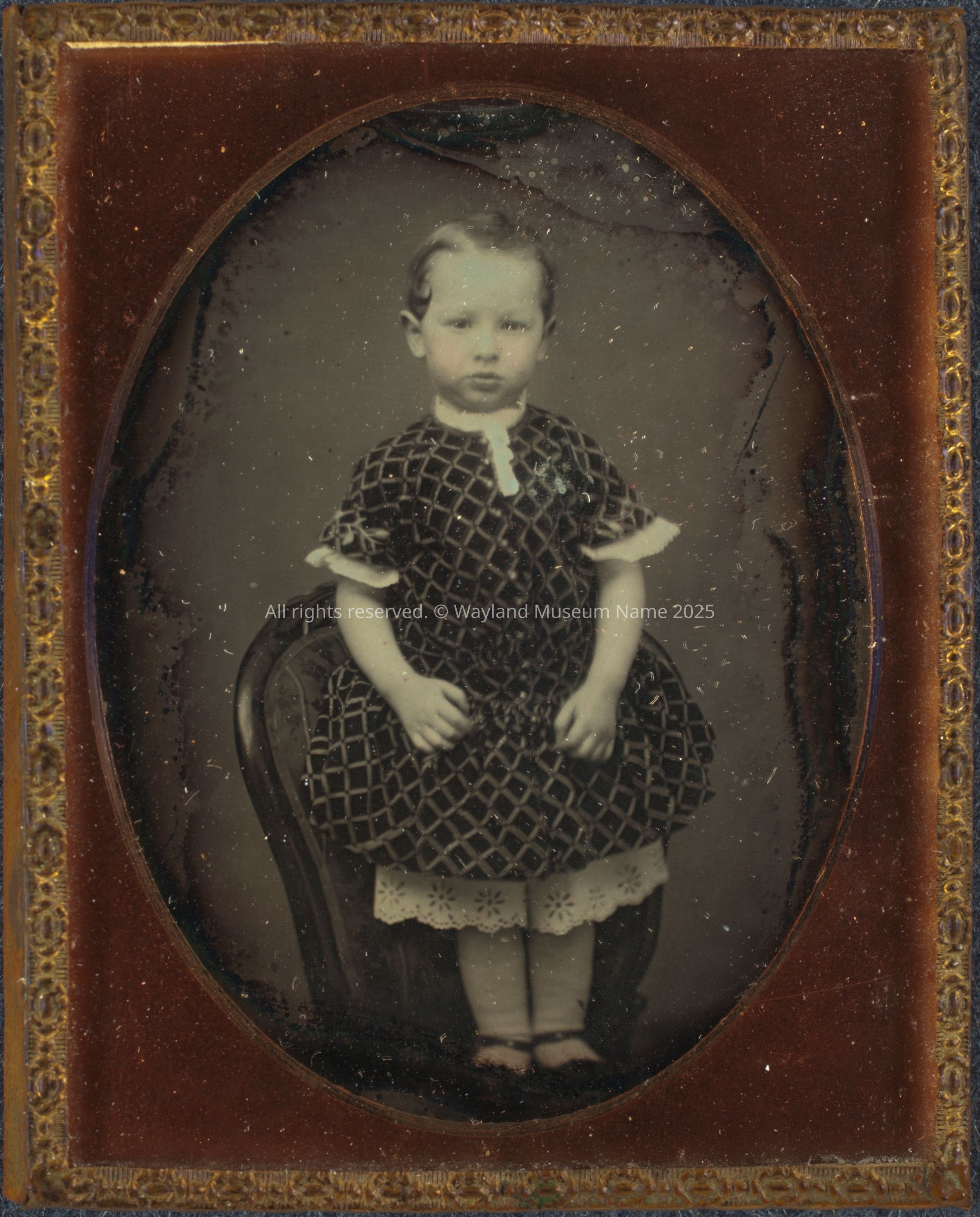 Daguerreotype: Unidentified child; by National Daguerrian Gallery, Court Street, Founded 1840, "The oldest establishment of the kind in Boston," oval, metal frame