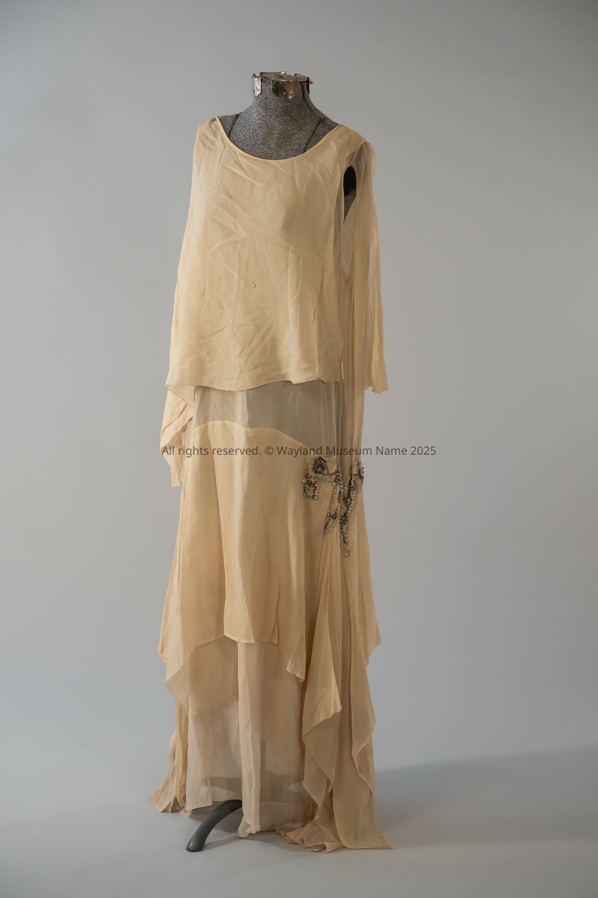 SBC Item: ca. 1927 Description: White - handkerchief tiered skirt - one-piece - machine sewn. Material: Chiffon - glass and metal beads.