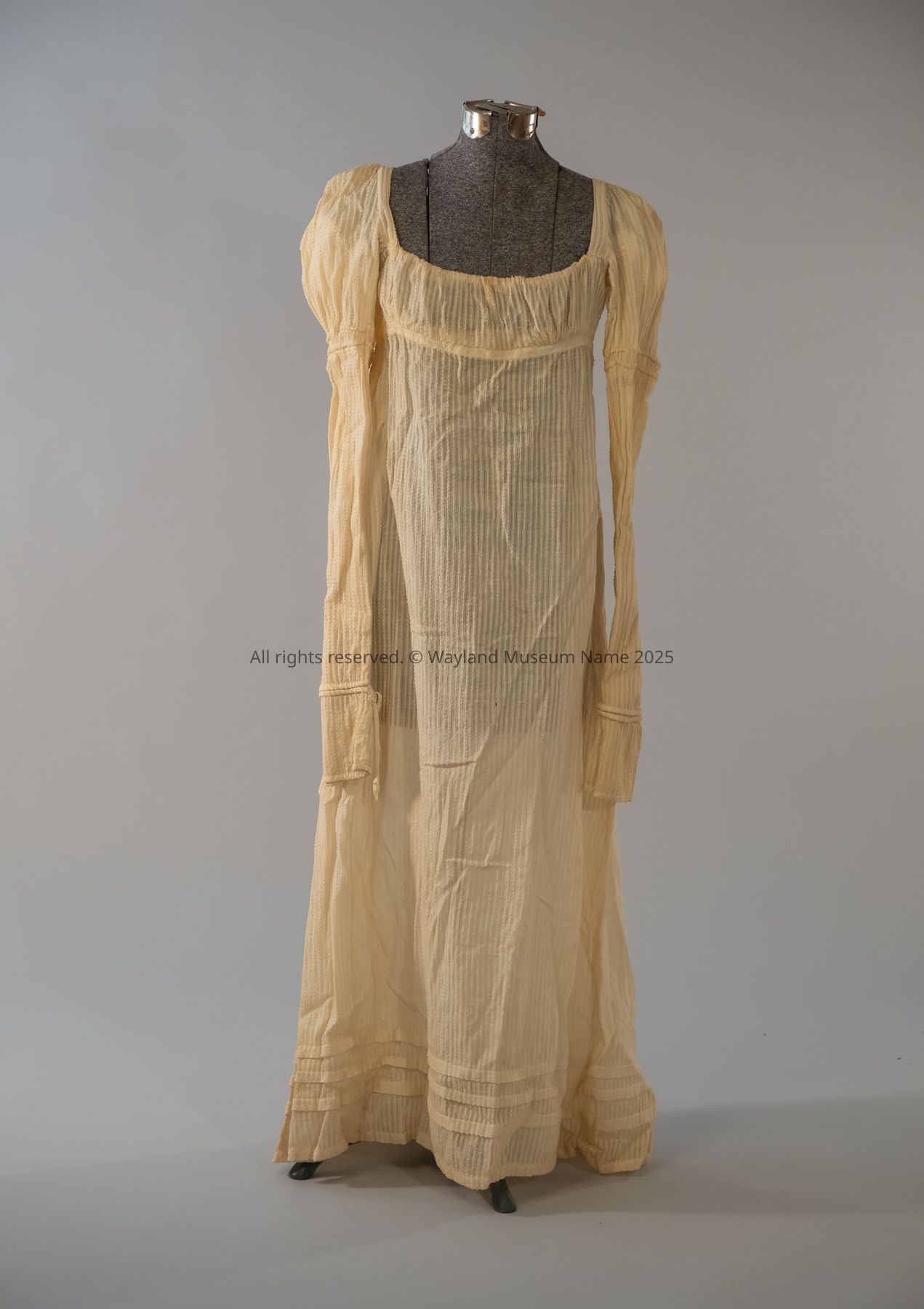 White - long sleeves - smocked at shoulders - cuff with button bodice shirred with white work - low square neckline - long gathered skirt - high waist - trimmed with white work - small piece of material with hooks and eyes added to lining sometime during the 20th century.Acquisition