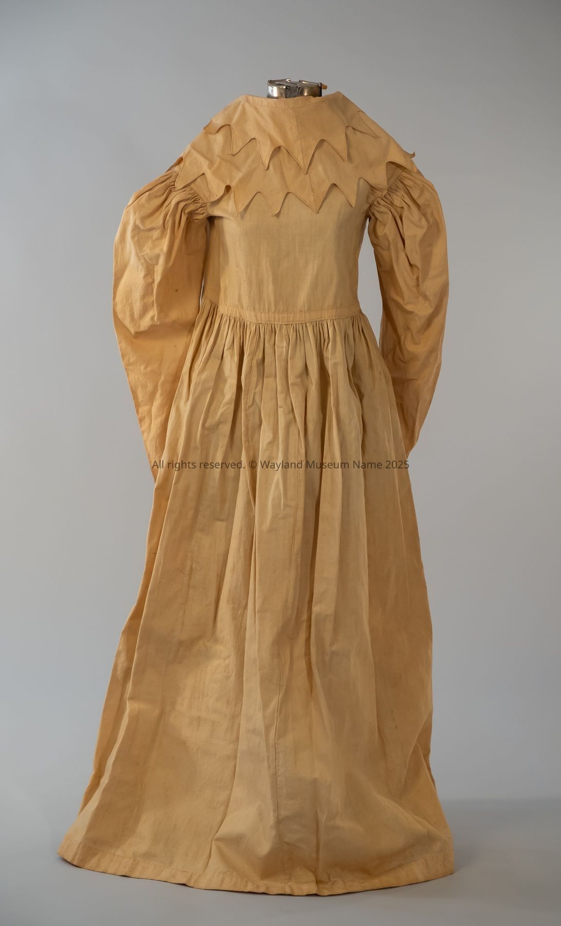 Beige - long sleeves with gathering at top - bodice had three set of buttons - Van Dyke collar - skirt gathered in back, flat in front - hand sewn.