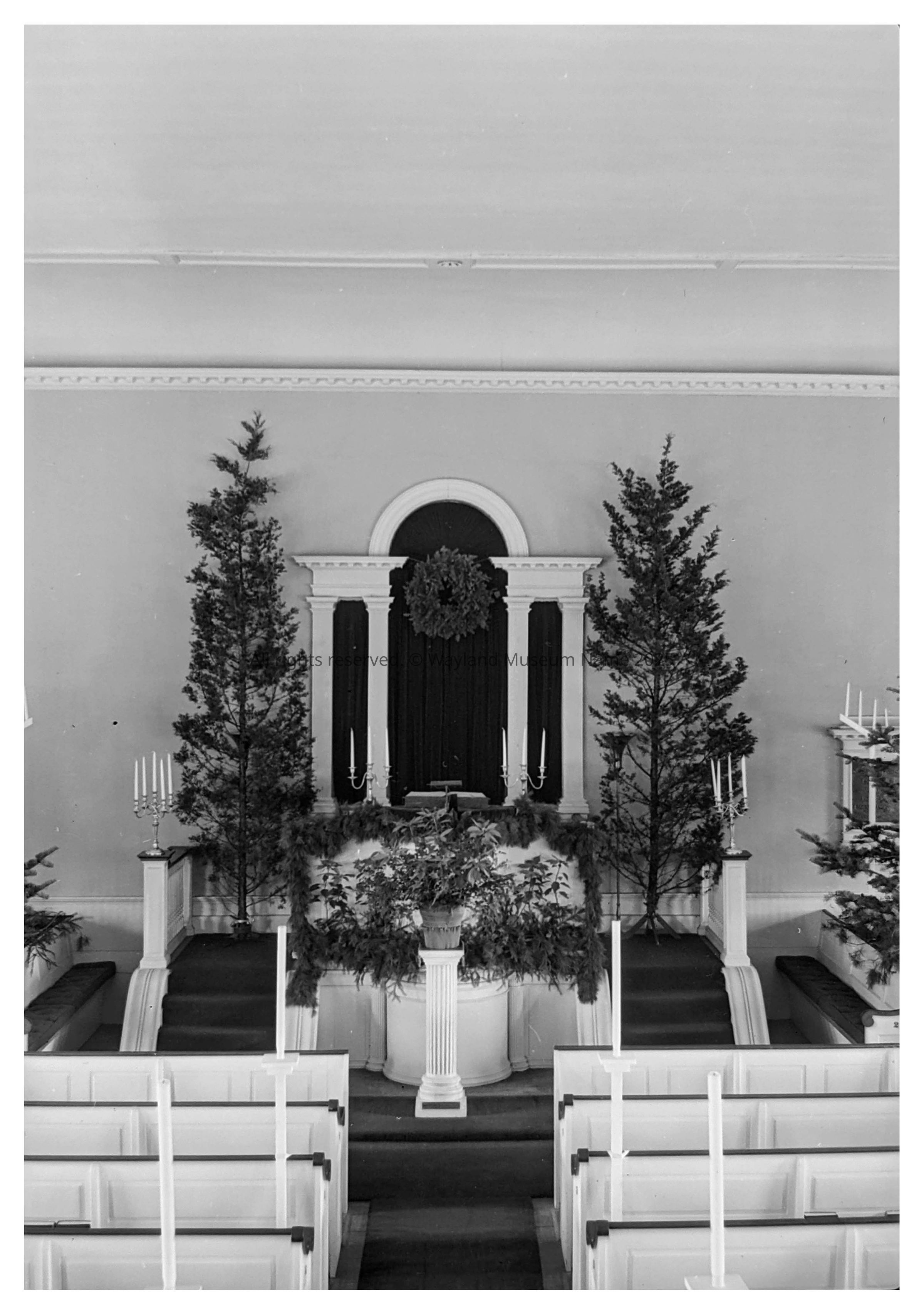First Parish Church, Christmas 1940 -- interior Construction of the present church building was begun in 1814 and completed in 1815. The building conforms largely to a federal model of the architect Asher Benjamin.Collection