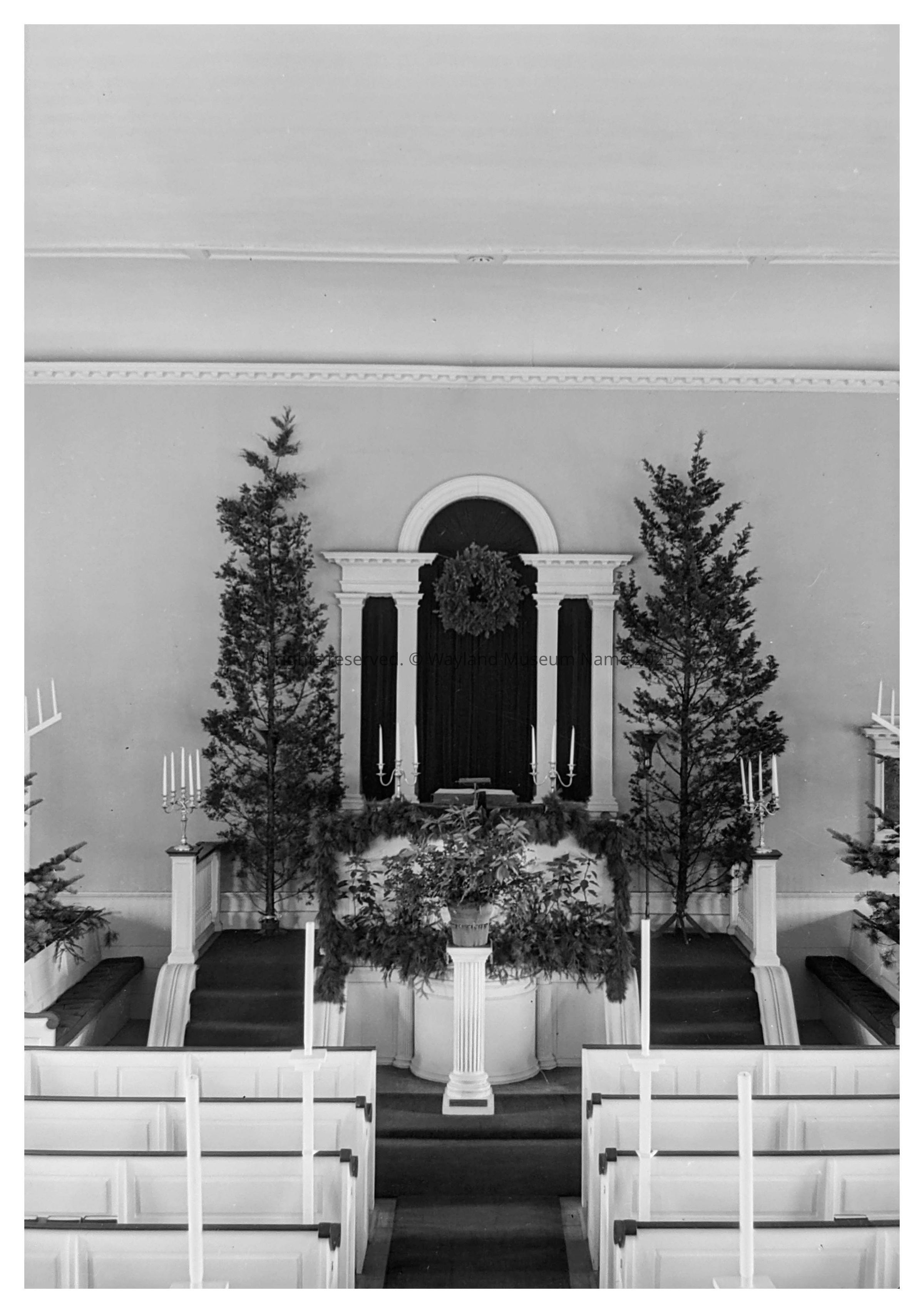 Folsom, Wallace Herbert, (1884-1954) -- Photographer First Parish church-- Wayland, (Mass.) Unitarian Universalist Church -- Wayland, (Mass.) Poinsettias Evergreen trees Garland Wreath CandelabraDimensions