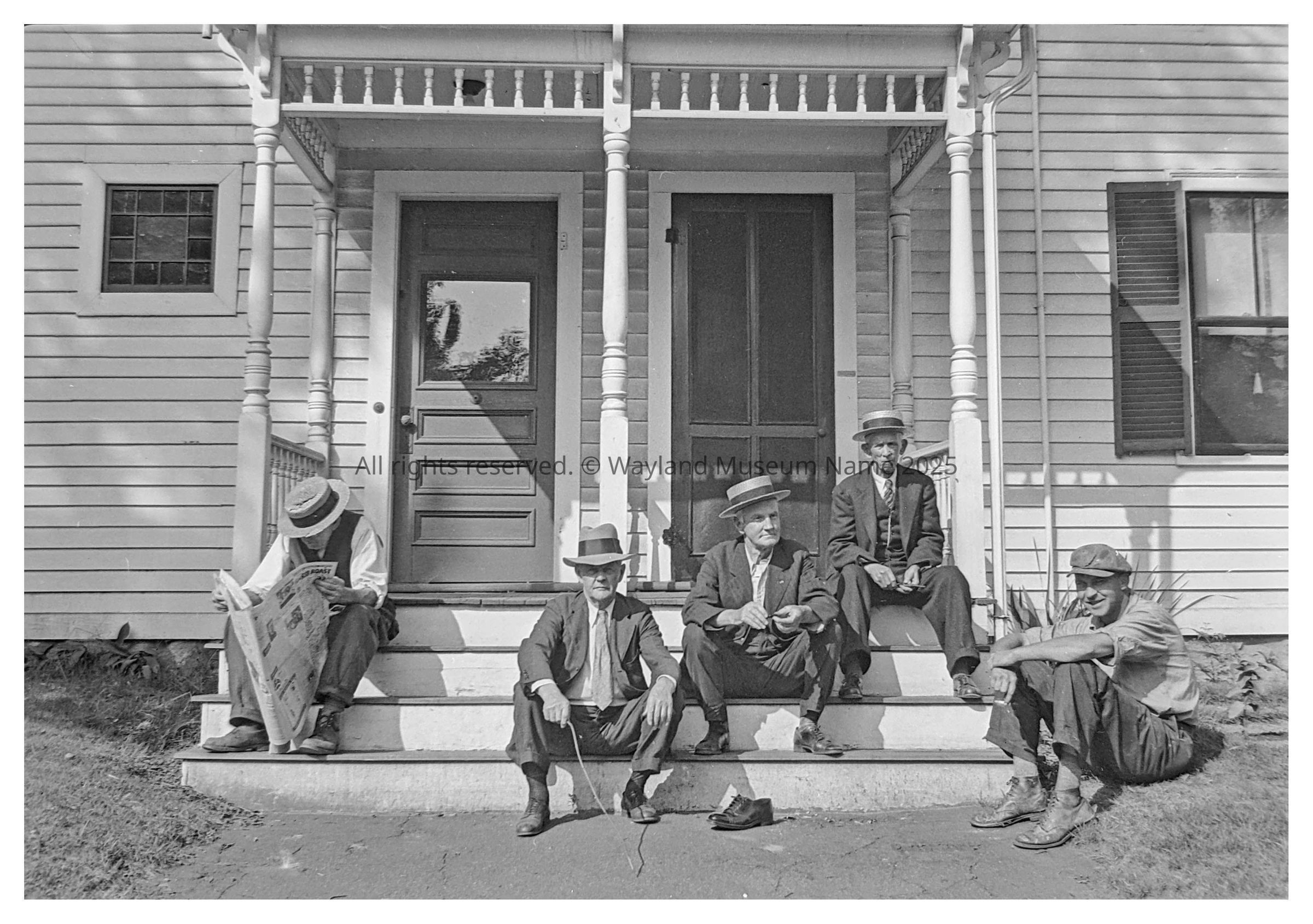 During nice weather the front steps of the George Smith house (more recently c.2020 Pei Lin's) in Wayland Center served as a favorite gathering place for this group, whose members carefully studied the passing scene. Except for the gentleman with the broken straw hat deeply absorbed in his newspaper, the others have been identified: (L to R) Andy Eagan, Arthur "Stubby" Atwood (Express agent at RR), Daniel Graham, Maurice (Graham's brother-in-law and RR gate keeper), and Alfred Alward. Note their Panama hats, and the relative formality of their step-sitting attire. Unexplained is the single shoe, on the walk at the bottom of the steps.Photograph Details