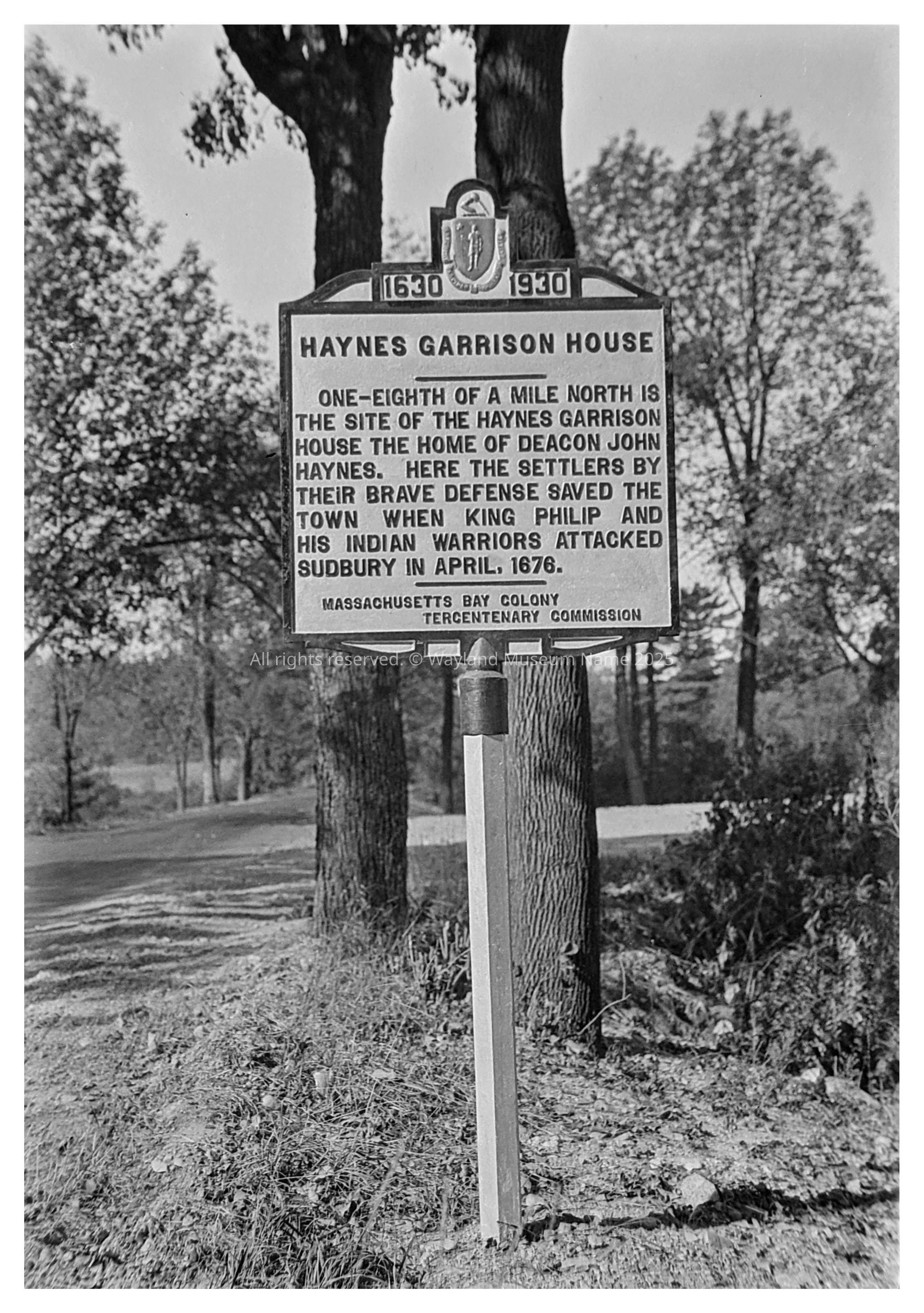 Haynes Garrison House site 1930 Tercentenary marker Inscription: One-Eighth of a mile north is the site of the Haynes Garrison House the home of Deacon John Haynes. Here the settlers by their brave defense saved the town when King Philip and his Indian warriors attacked Sudbury in April, 1676.