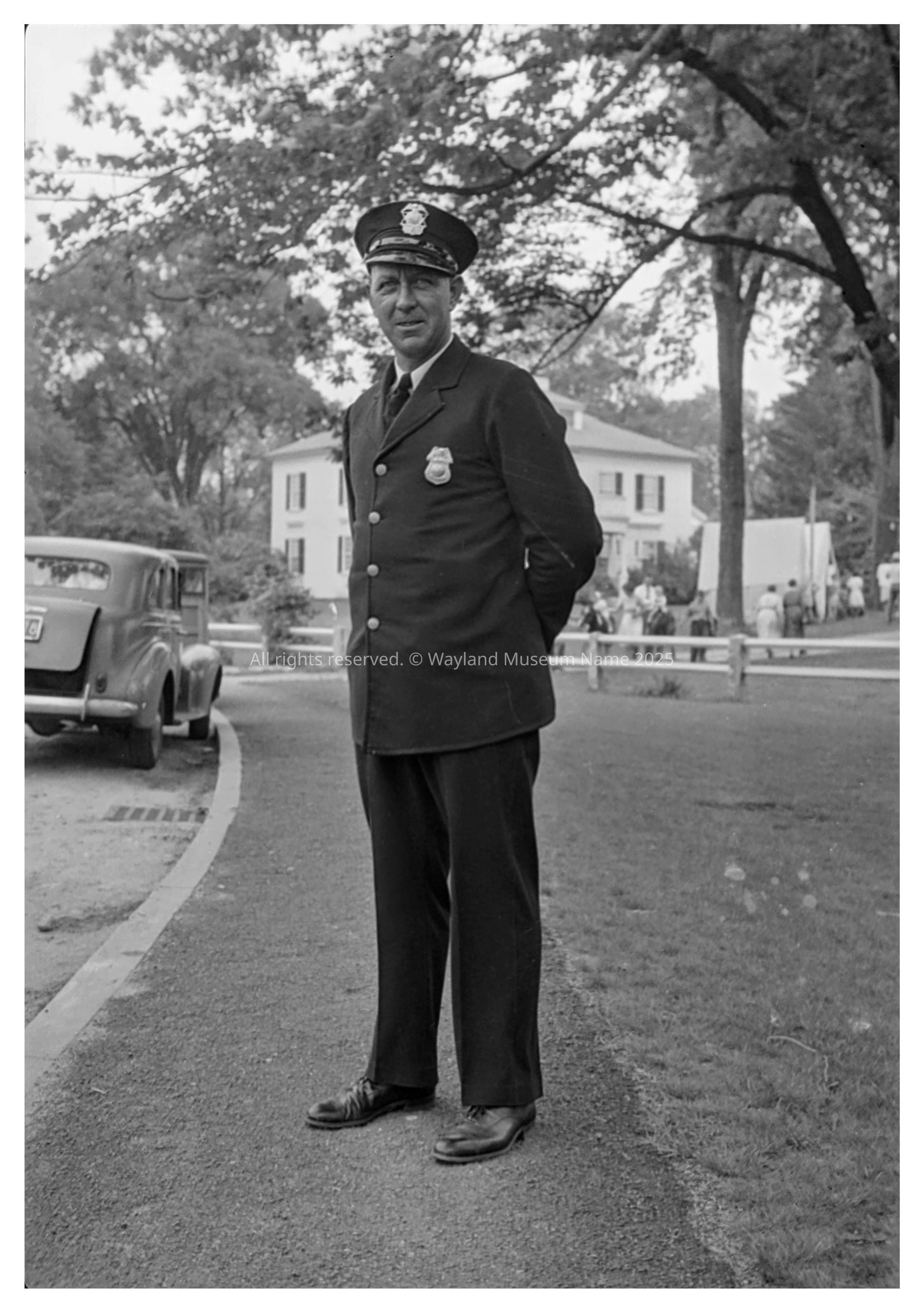 Policeman, Johnny Linnehan, is standing in front of the First Parish Church alongside Route 20. The occasion is the dedication of this section of the route as "The George Washington Memorial Highway" in July 1932. Pony rides are on the Kirkside property nextdoor. The Linnehan family came to Wayland from Ireland in 1869, settling on a farm on the Boston Post Road (Route 20). They later became active in town affairs.Photograph Details
