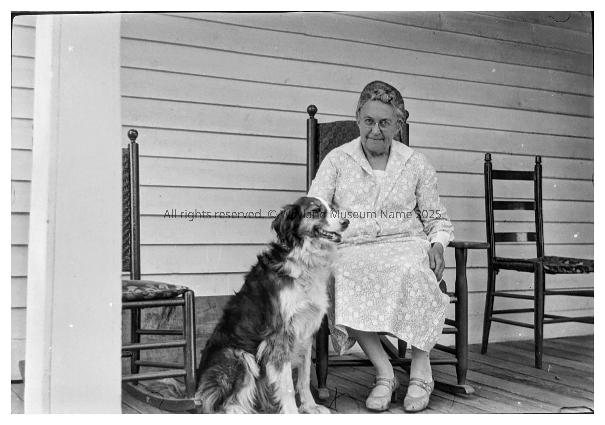 Mary (Folsom) Damon, wife of Isaac Damon, at her home at 67 Old Sudbury Road carefully making her dog "Laddie" hold still. She was the older sister of Wallace Folsom's father, George Benjamin Folsom.Collection