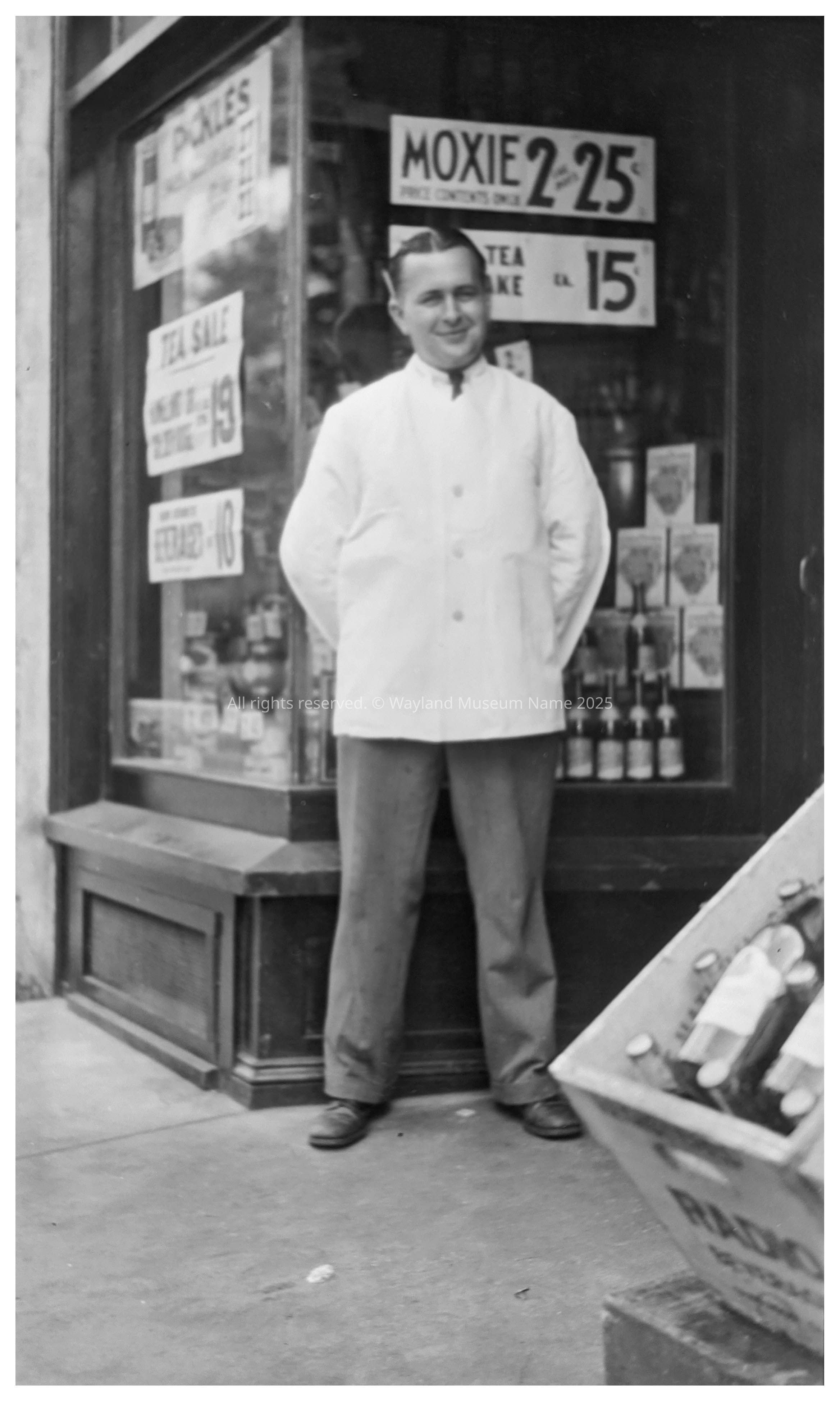 Lewis "Louie" Graves, the manager of the First National Store on Boston Post Road, stands proudly in his white coat, which implies cleanliness and high standards of hygiene. A newspaper account (1954) reported that "Louie" came "to the little store on State Road East in March, 1929" where "he became an institution, not only because of the products he sold, but because of his unruffled demeanor in the face of impatient customers and his willingness to cash checks."Photograph Details