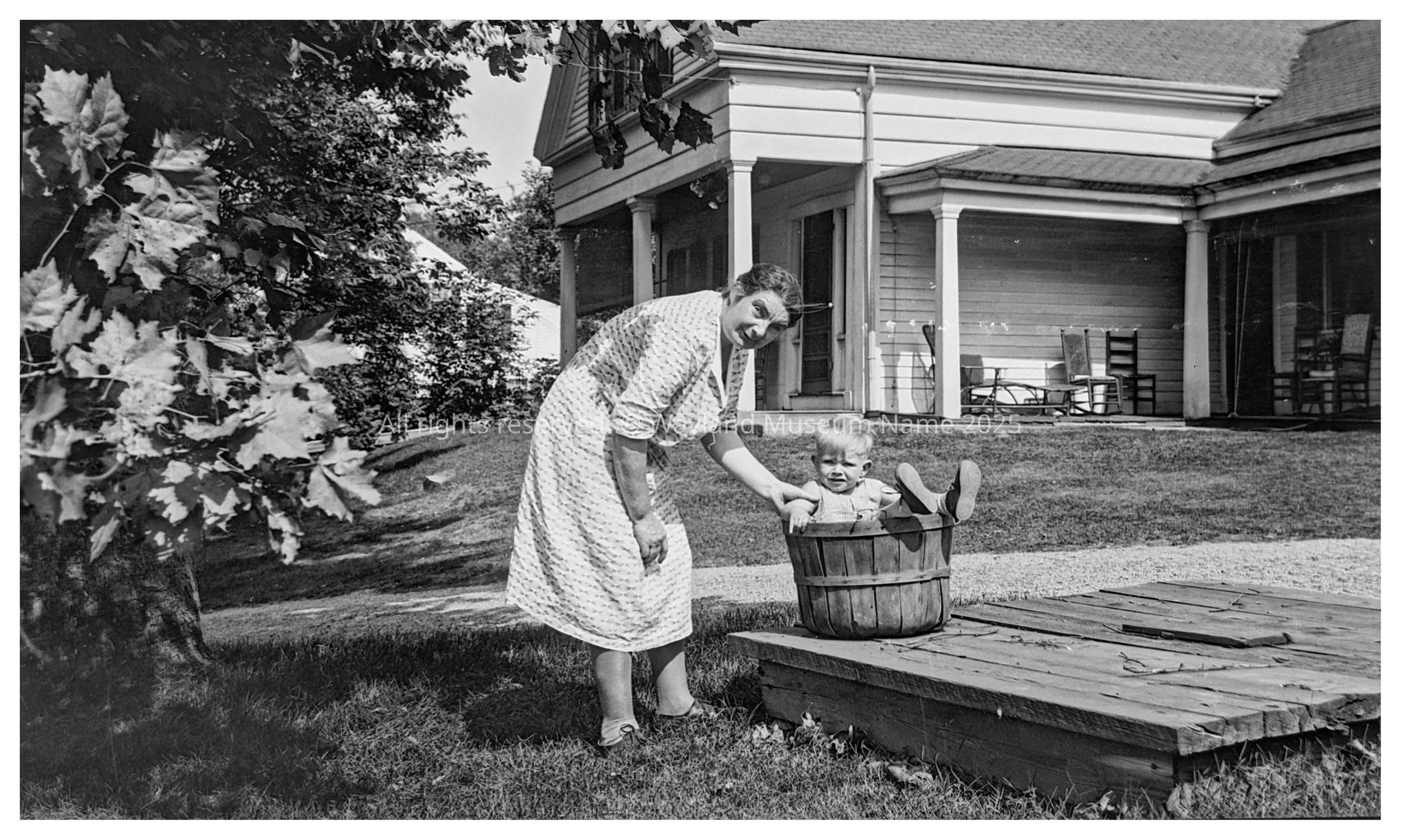 Mrs. Doane with male toddler by well pump at Mabel Damon’s, 67 Old Sudbury RoadPhotograph Details
