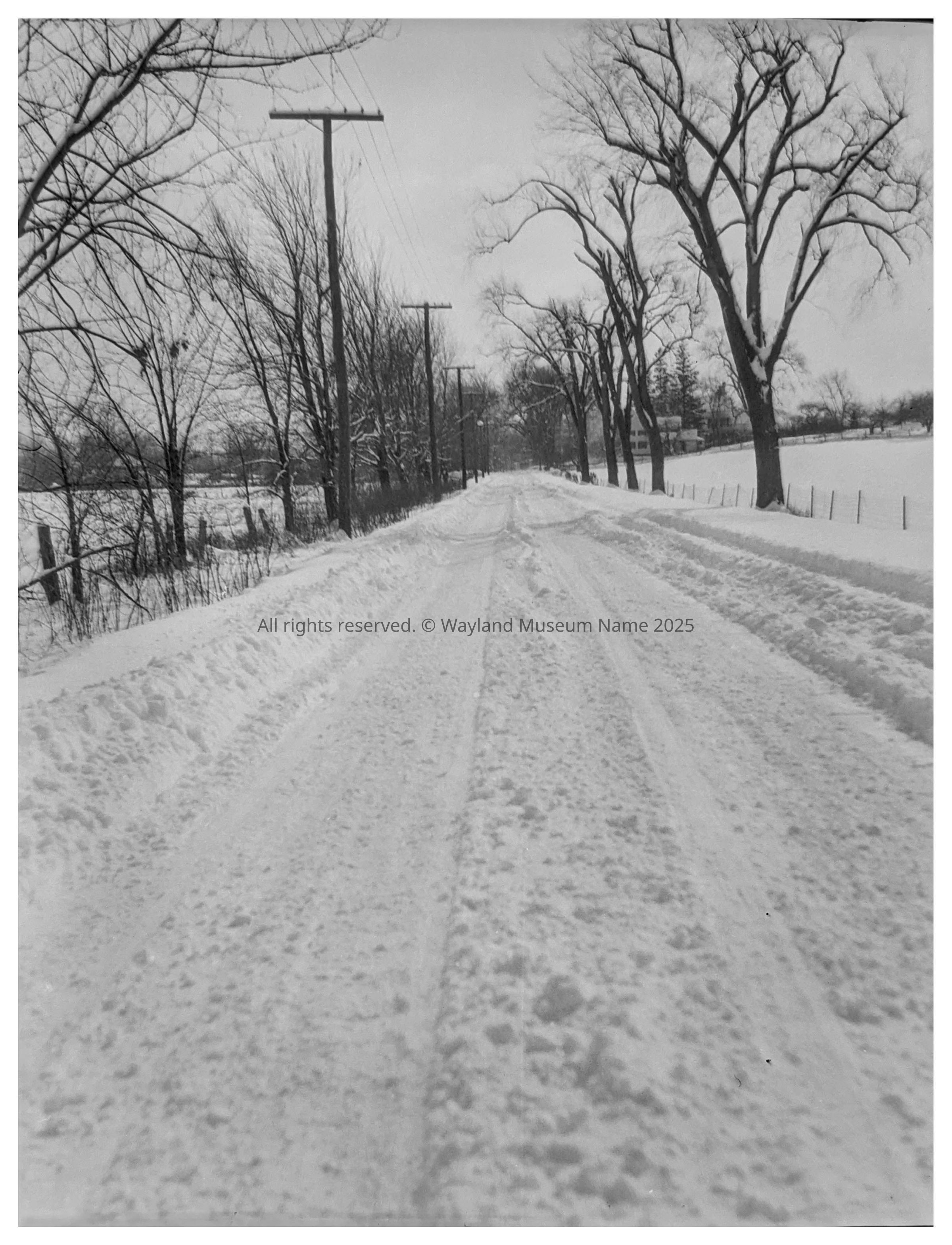Folsom, Wallace Herbert, (1884-1954) -- Photographer Winter -- Snow plowed road Old Sudbury Road -- Wayland, (Mass.)Dimensions
