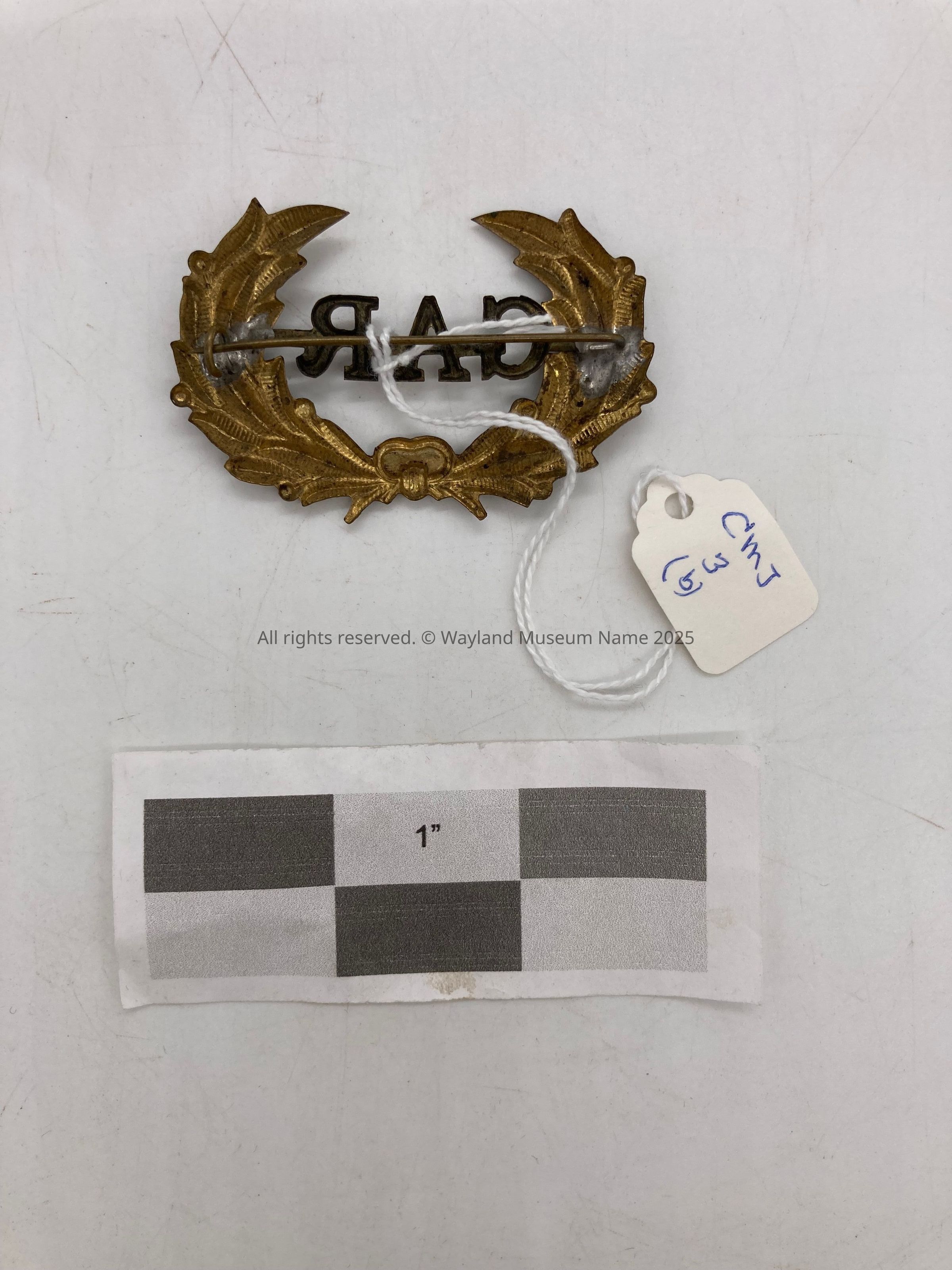 - (c) black metallic "GAR" letters within arms of branches, tarnished, wool background [#437 (1965.10) Miss Sarah Lovell gave GAR insignia]