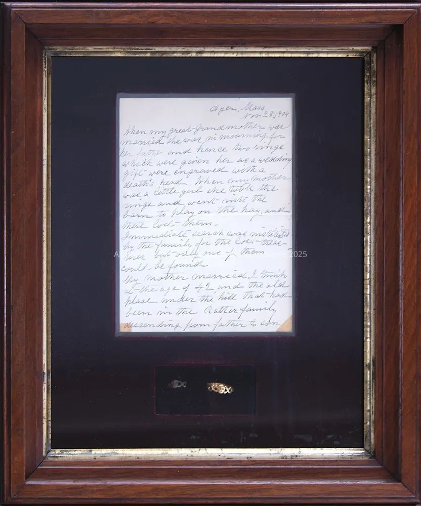 2 - Rings: Explanatory letter written by Nellie P. Draper, mother of donor. 2 rings engraved with deaths heads - since bride was in mourning for her father. 1 bears date 1760, also B. Bent - AE 44 - letter explains loss, finding of rings on "the old place under the hill" that had been in the Rutter family from John Rutter (1638) (now Eckler - Bow Rd.)Context