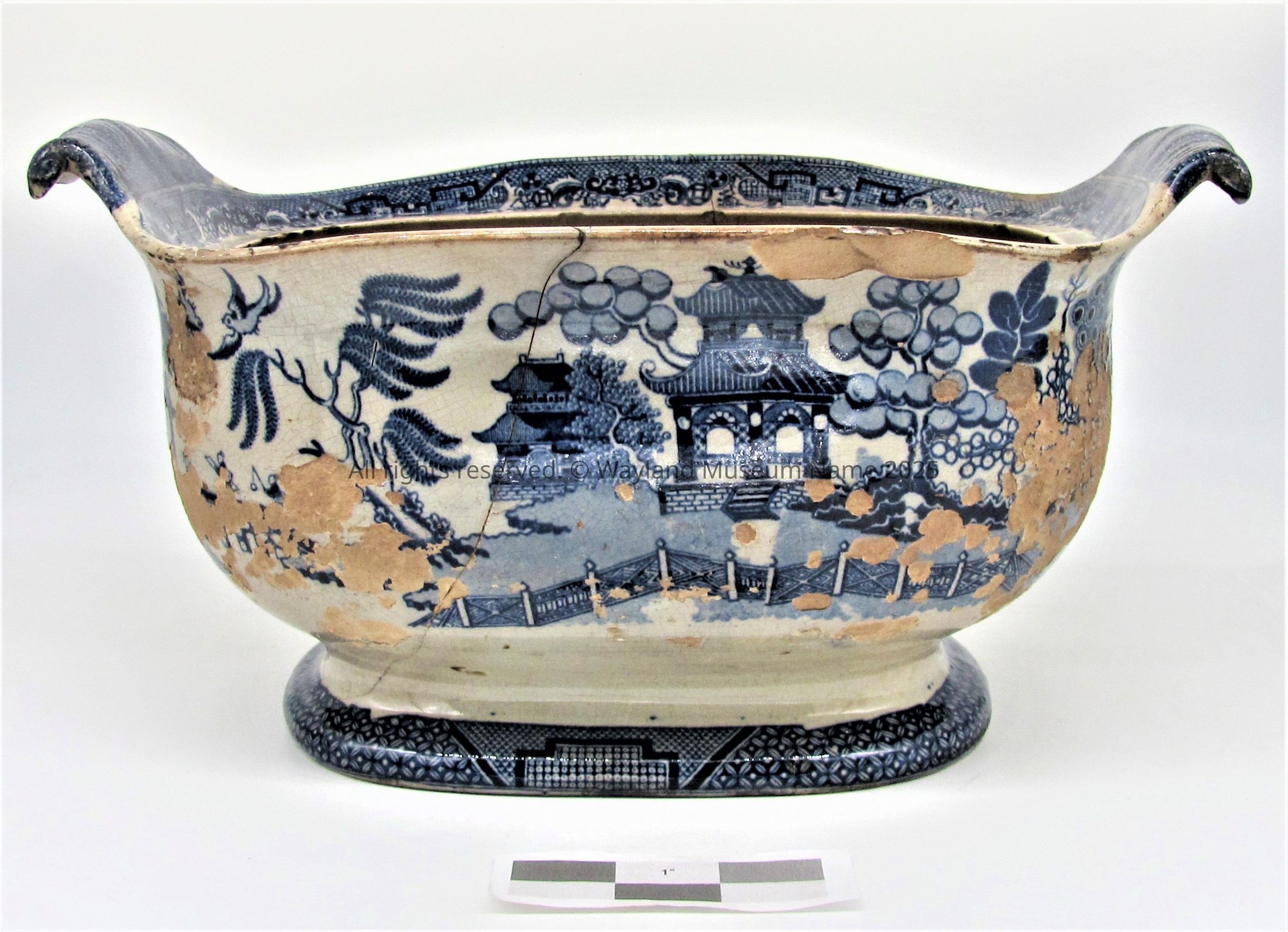 Soup tureen (no cover, no ladle): deep blue on white; Chinese scene with pagoda, trees and ferns. Willow pattern-19th C. Unusual handle shape which is formed out of the bowl and not an attached piece, unusual bulbous shape bowl,