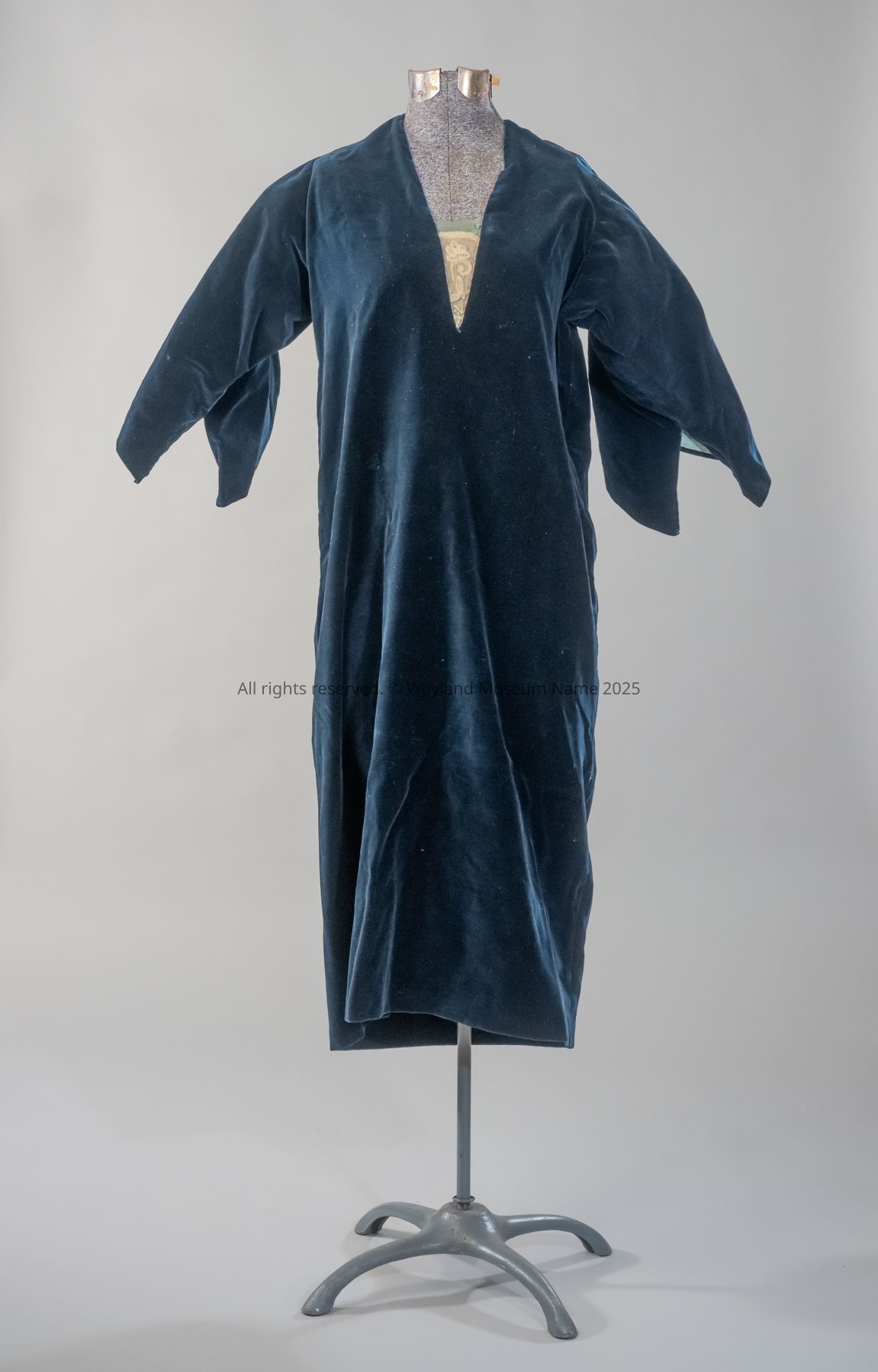 Navy blue, dormer sleeves, lace insert in "V" neckline, blue crepe trim, sleeves lined in aqua blue crepe, machine and hand sewn, no waist line, short skirt.Collection