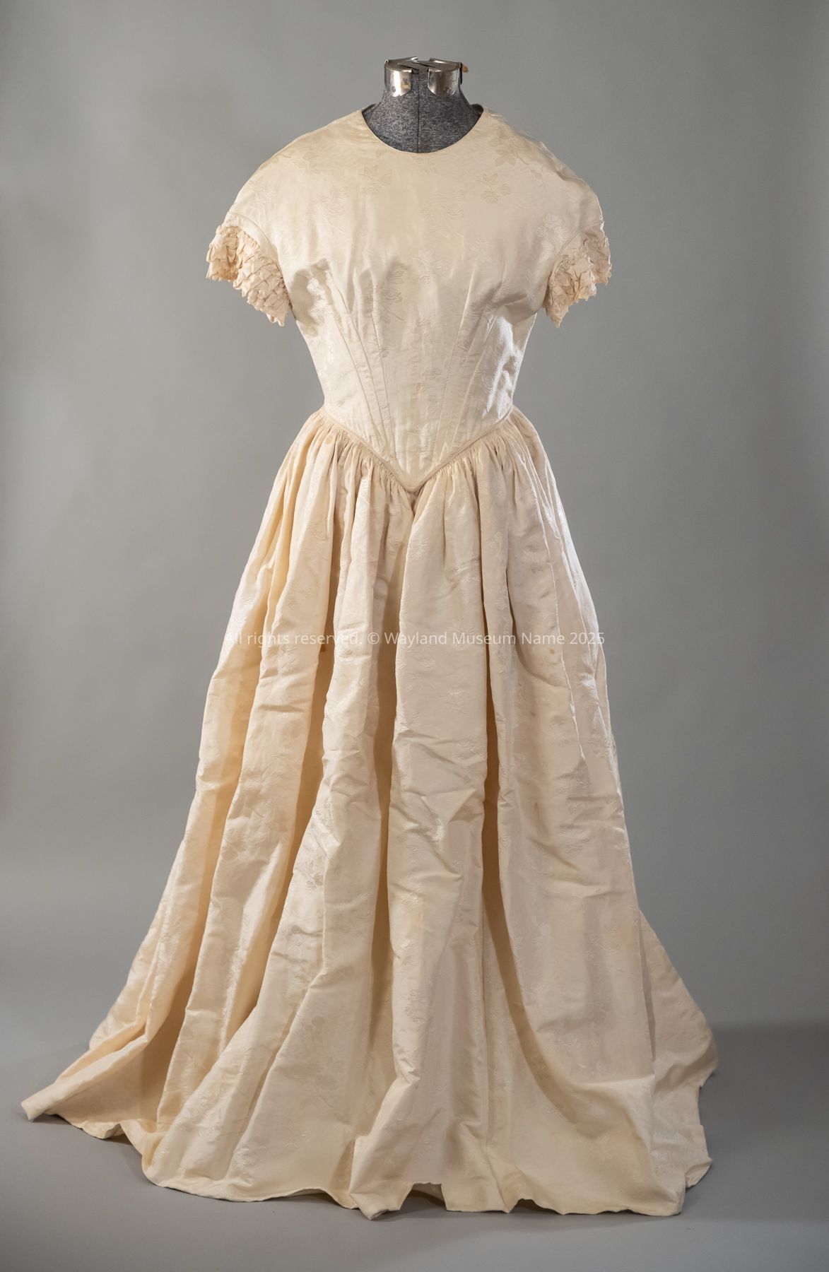 1850 wedding dress, ivory color silk, woven in rose pattern, hand sewn; in excellent condition, laced in back, short sleeves with 3 ruffles & tucks (WHS-#C252).